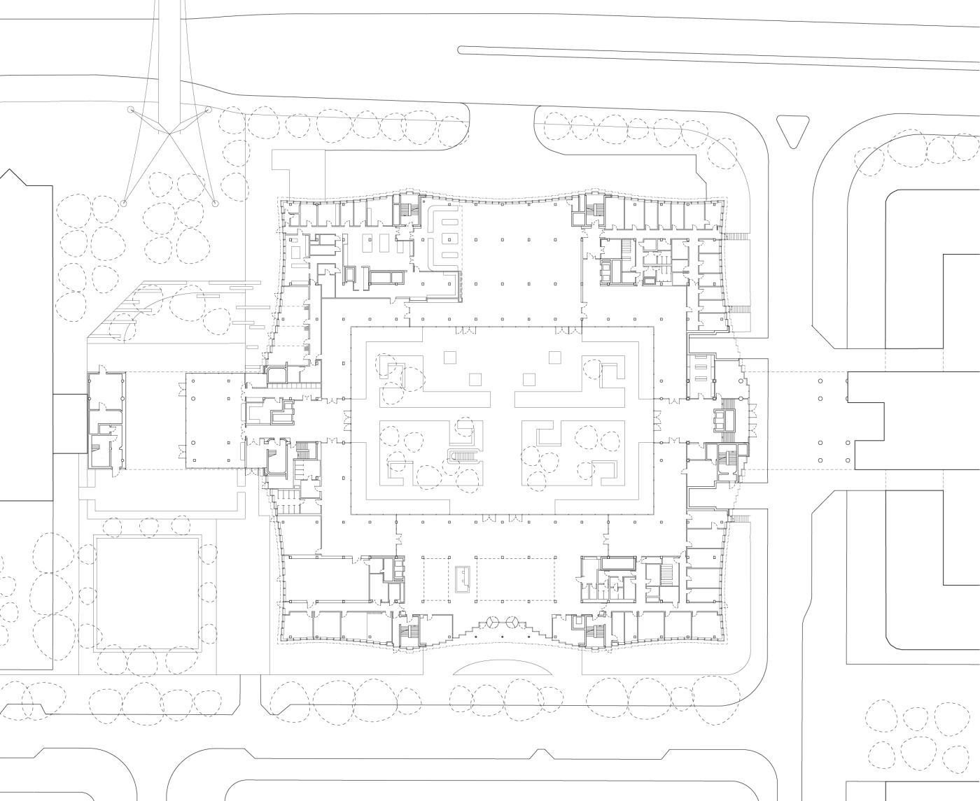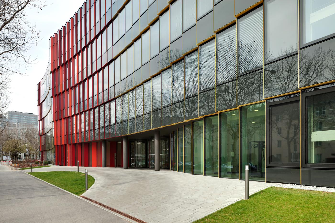 Die neue Hülle gewährleistet die aktuell relevante Wärmedämmung, Schall- und Sonnenschutz, Tagesbelichtung sowie die natürliche Belüftung der Büroräume. Im Inneren entstanden durch Einschnitte zwei tagesbelichtete Atrien, die Raum für interne Kommunikation bieten und zugleich die natürliche Querlüftung im gesamten Gebäude ermöglichen. Durch die Verlagerung des Haupteingangs an die Berliner Straße sowie die Einführung eines am Innenhof angelagerten Galeriegangs im Erdgeschoss wurden Erschließung und Orientierung erheblich verbessert und repräsentative Empfangsräume geschaffen.