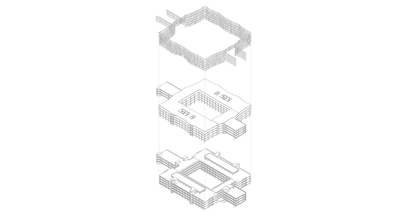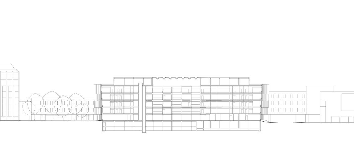 Die Generalsanierung eines Verwaltungsgebäudes aus den 1980er-Jahren ergab die seltene Gelegenheit, ein Bestandsgebäude vollständig zu umzunutzen. Neben der energetischen Sanierung des Hauses wurde die Qualität der Arbeitsplätze drastisch verbessert. Die komplette Erneuerung der Fassade wurde genutzt, um ein bisher gesichtsloses Gebäude am Stadtring zu einem eleganten und überraschend lebendigen Gebäudekomplex umzugestalten. Nach Entfernung der massiven Fensterbrüstungen wurde die Außenhaut so modifiziert, dass die bisher dominierenden Treppenhäuser in eine neue, konkav geschwungene Gebäudekubatur integriert werden.