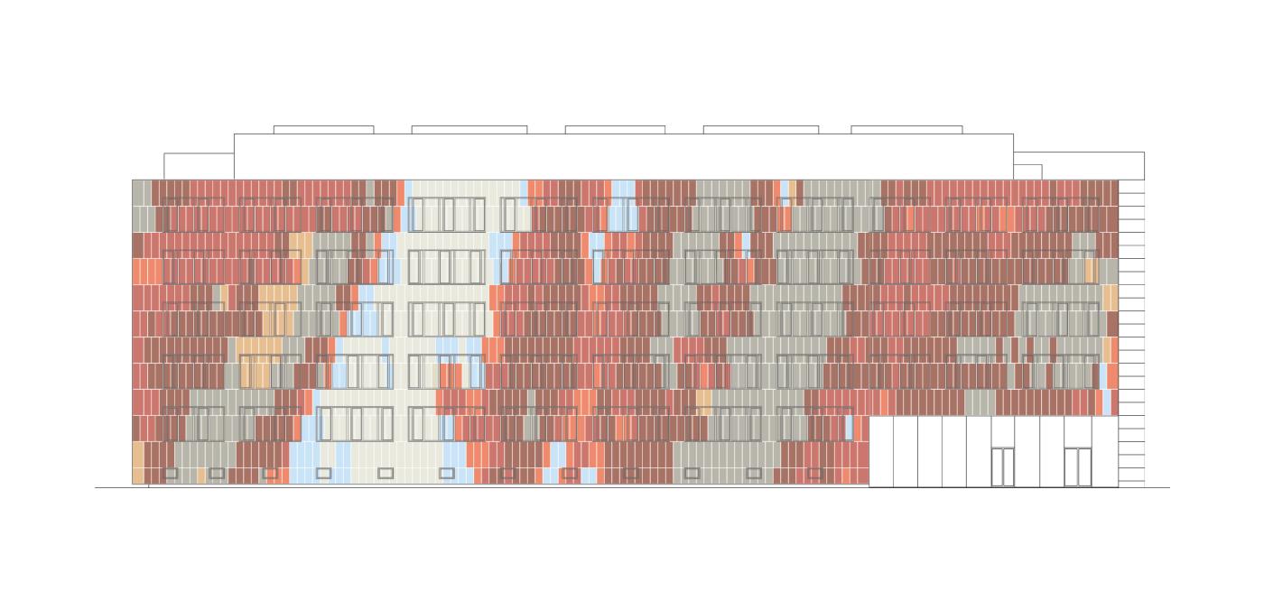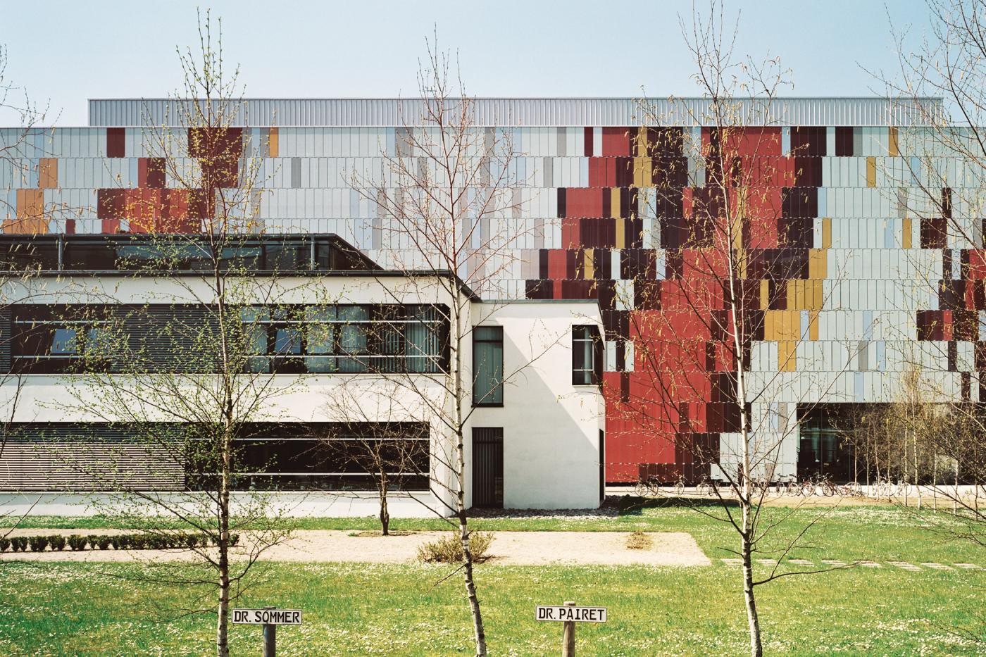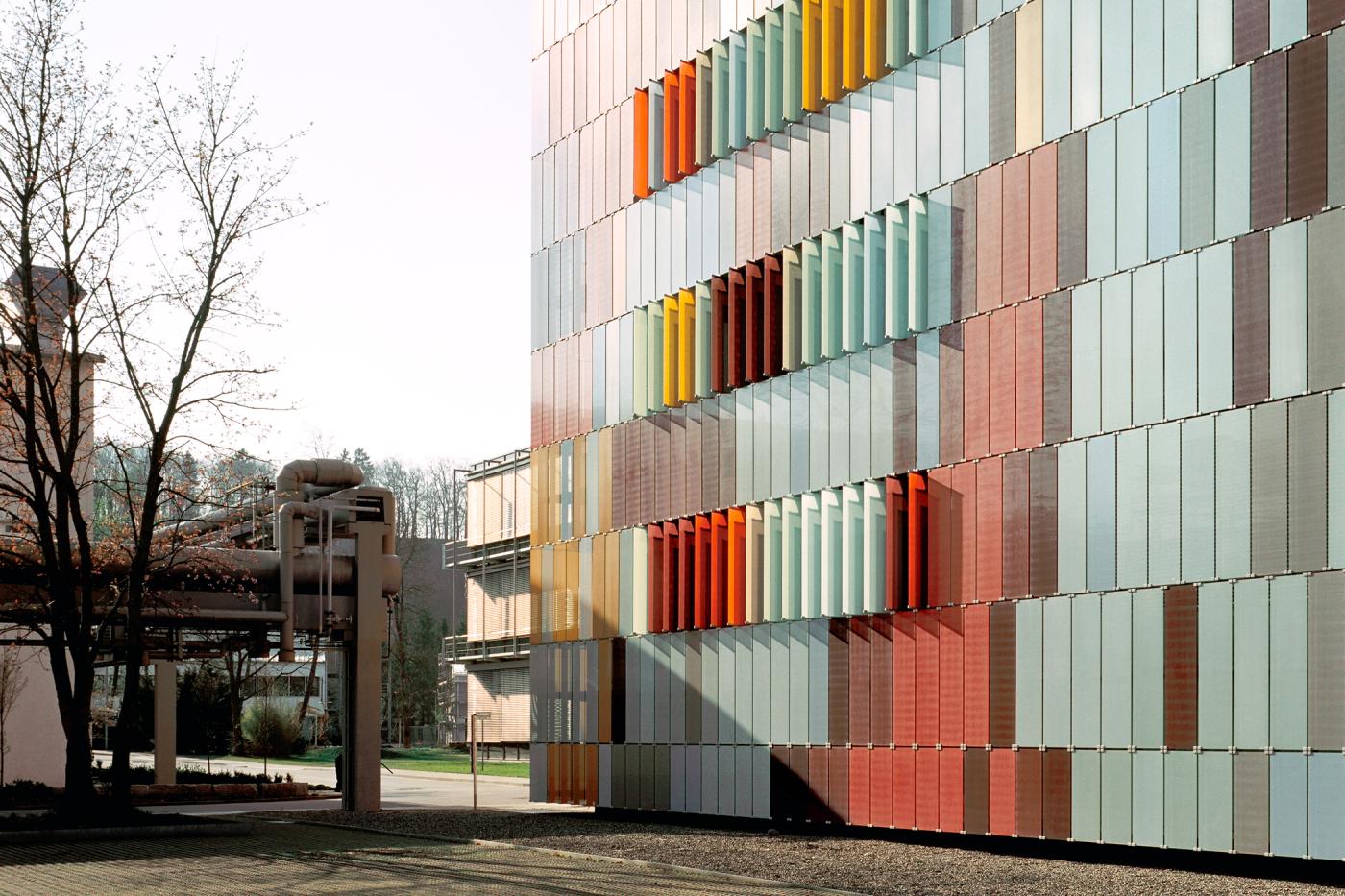 Dieses Gebäude erscheint wie ein bewohntes Bild. Es besteht aus einem einfachen Volumen, auf dessen Glashaut ein durchgängiges, farbiges Muster aufgebracht ist. Diese Behandlung gibt dem Haus zunächst einen eigenen Maßstab und überraschende Skulpturalität sowie ein unverwechselbares und lebendiges Erscheinungsbild in seinem Umfeld. Das Bild ist aus der monumentalen Vergrößerung einer mikroskopischen Aufnahme eines der hier produzierten Präparate entwickelt worden. Somit wird es auch zum Symbol der Nanowelt in der biologischen Forschung, in die der Besucher beim Betreten des Hauses eintaucht. Als architektonisches Element fasst die Fassade die verschiedenen Teile des Hauses zusammen, als technisches dient sie als schützende Haut gegen Sonne, Wind und Regen.
