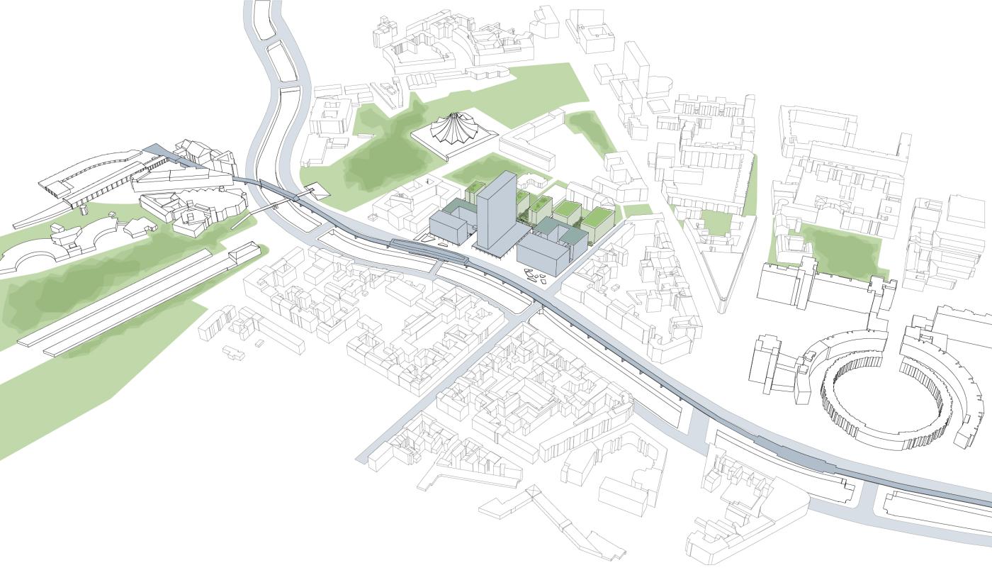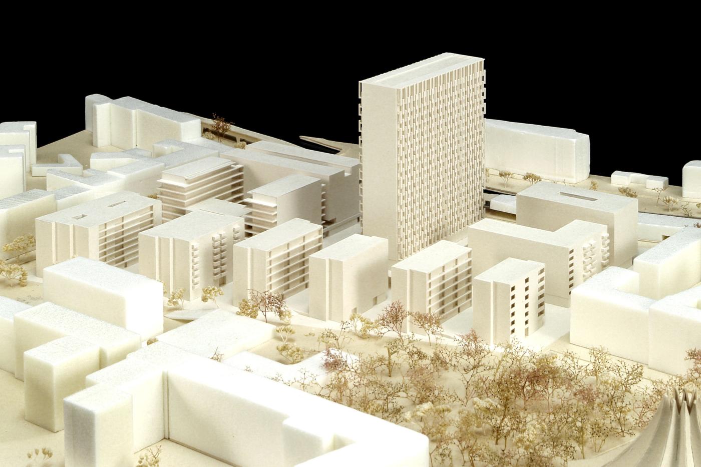 - Masterplan für ein städtisches Sanierungsgebiet mit Mischnutzung aus Wohnen, Einzelhandel, Büros, Hotel, Kindertagesstätte; ein bestehendes Hochhaus wird erhalten und umgenutzt
