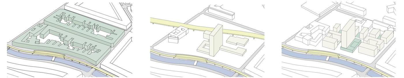 Der neue Vorschlag interpretiert diese überlagerten Strukturen, setzt aber auch eigene Akzente. So wird im Verlauf der einst geplanten Stadtautobahn im Norden ein öffentlicher Grünzug vorgeschlagen, in der Mitte ein Wohnquartier am Park und im Süden ein gemischt genutztes Quartier am Kanal, das das bestehende Hochhaus rahmt. So entsteht eine Komposition von Einzelfiguren und Zwischenräumen, die an die bestehenden Bauten, Räume und Wegebeziehungen anknüpft und beide städtebaulichen Haltungen miteinander vereint: die freie Anordnung von Solitären und die Fortsetzung der Kreuzberger Straßenräume.