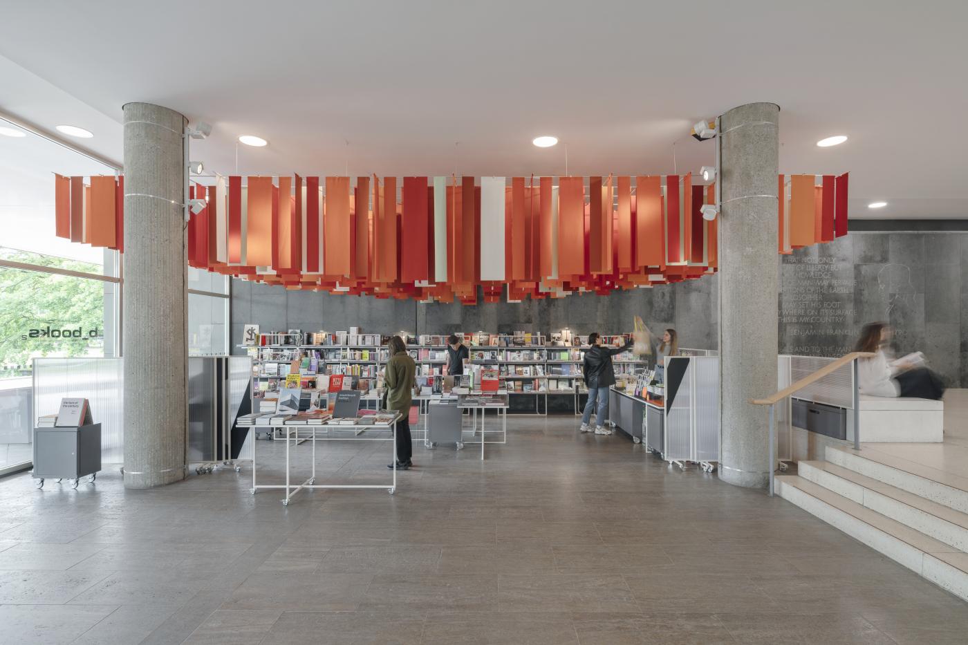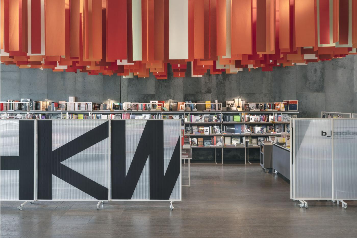 Der Buchladen im Haus der Kulturen der Welt war als temporärer Raum mit wiederverwendeten Elementen aus früheren Ausstellungen konzipiert. Als Teil der großen Eingangshalle befand er sich in einer Art Durchgangsraum, der sich durch minimale Eingriffe in einen Raum der Begegnung unter einem schwebenden Baldachin in roten Farbnuancen verwandelte.