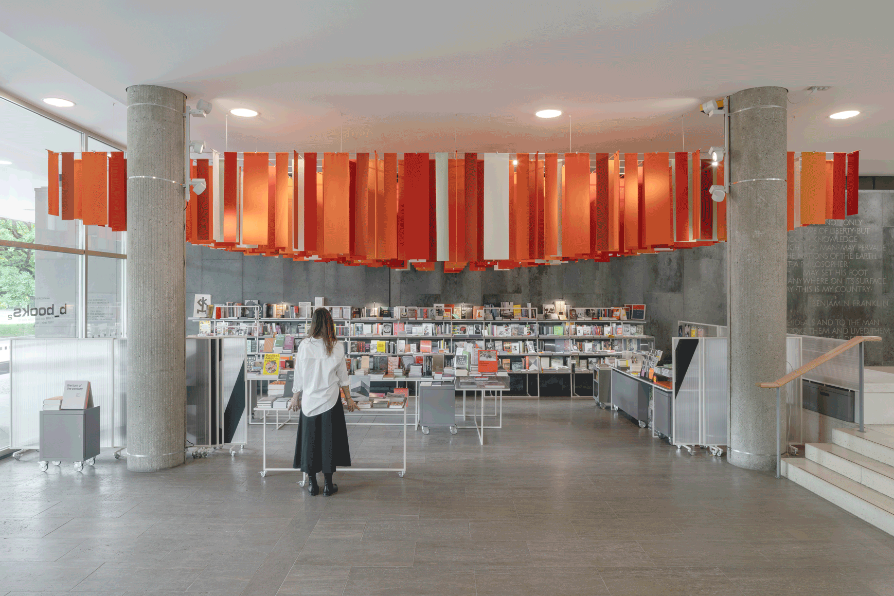 In Verbindung mit den Büchern brachte die Deckengestaltung Bewegung und Farbigkeit in den Raum und bildeten einen Kontrast zu der ansonsten gedämpften Farbgebung der Architektur und der neuen Einbauten. Die Wolke aus abgehängten Stofffahnen sorgte nicht nur für eine verbesserte Akustik, sondern markierte auch die Grenze der Buchhandlung und ließ sie von weitem deutlich erkennbar werden. Oszillierende Rot-, Orange- und Weißtöne erzeugten eine warme Atmosphäre für den darunter liegenden Raum, der dem Besucher zugleich ein Gefühl von Offenheit und Intimität vermittelte und die Konzentration auf das Lesen lenkte.