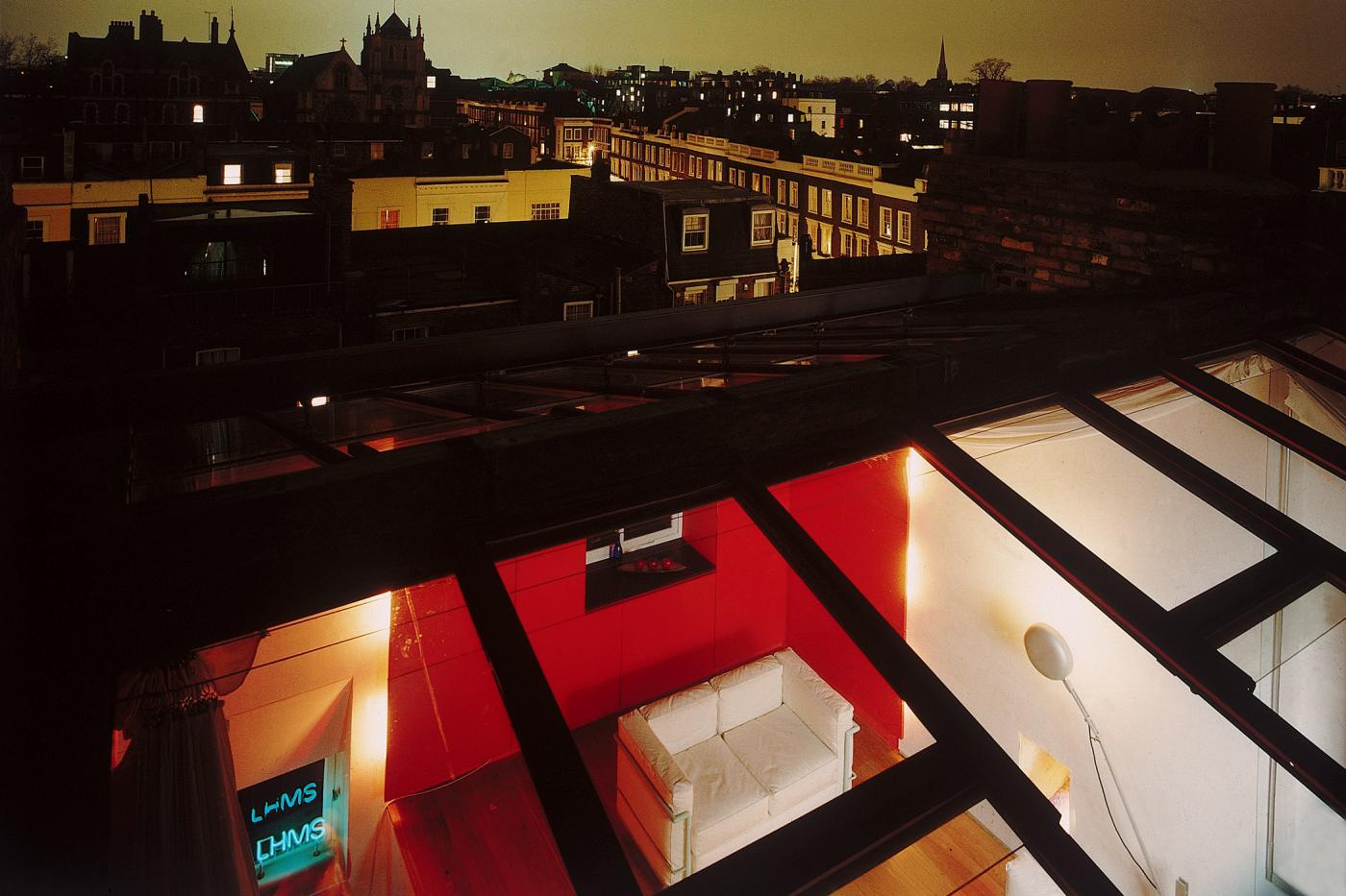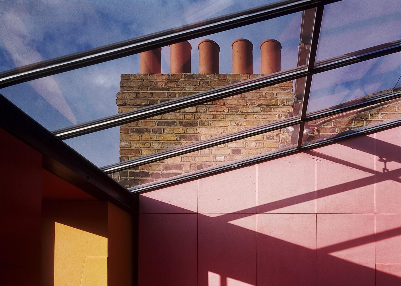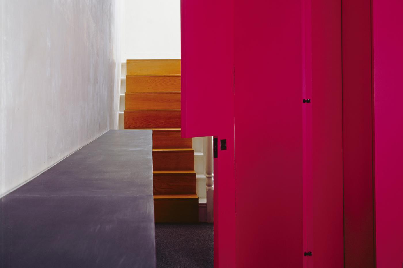 Das L House ist das erste realisierte Projekt, in dem wir Farbe als Material verwendet haben. Ein viktorianisches Wohnhaus wird in ein zweigeschossiges Büro und eine darüber liegende Maisonette umgebaut. Dabei wird die zellenhafte Struktur des originalen Gebäudes so weit aufgelöst, dass im obersten Geschoss nur noch die Außenwände übrig bleiben.