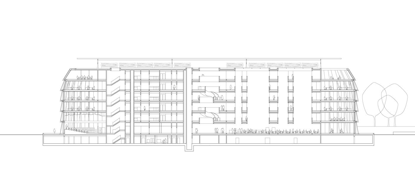Zur Stromerzeugung bündelt und lenkt das markante Flugdach die vorherrschenden westlichen Winde auf geräuscharme Windturbinen auf dem Dach. Die zweischichtige Glasfassade sorgt für gute Tagesbelichtung bis in die Tiefe des Gebäudes und funktioniert gleichzeitig als thermischer Puffer. Die äußere Schicht ist mit einer Photovoltaikbeschichtung versehen und dient so als Energiekollektor. Sie bietet auch Schutz gegen Wind und Lärm und ermöglicht, dass alle Fenster zur natürlichen Belüftung geöffnet werden können. Flexible Sonnenschutzlamellen in der Zwischenzone bestehen aus farbigen Lochblechen, deren Rottöne sich am traditionellen Backstein der Umgebung orientieren. Ihre Ausrichtung und damit die Lichtbedingungen an jedem Arbeitsplatz können individuell reguliert werden, sodass sich mit der Nutzung des Gebäudes die Erscheinung im Wechsel der Tages- und Jahreszeiten ändert.