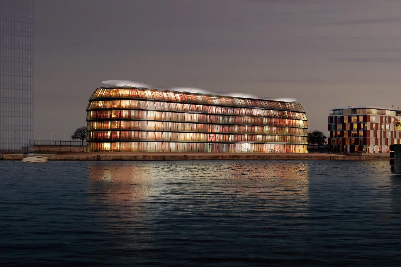 Das Verwaltungsgebäude für die FIH Bank, am Ende der langen Pier von Langelinie gelegen, verbindet die stereometrisch einfache Kubatur der benachbarten Lagerhäuser des ehemaligen Seehafens mit der Funktionalität eines zeitgenössischen, klimatomorphen Nullenergie-Gebäudes.