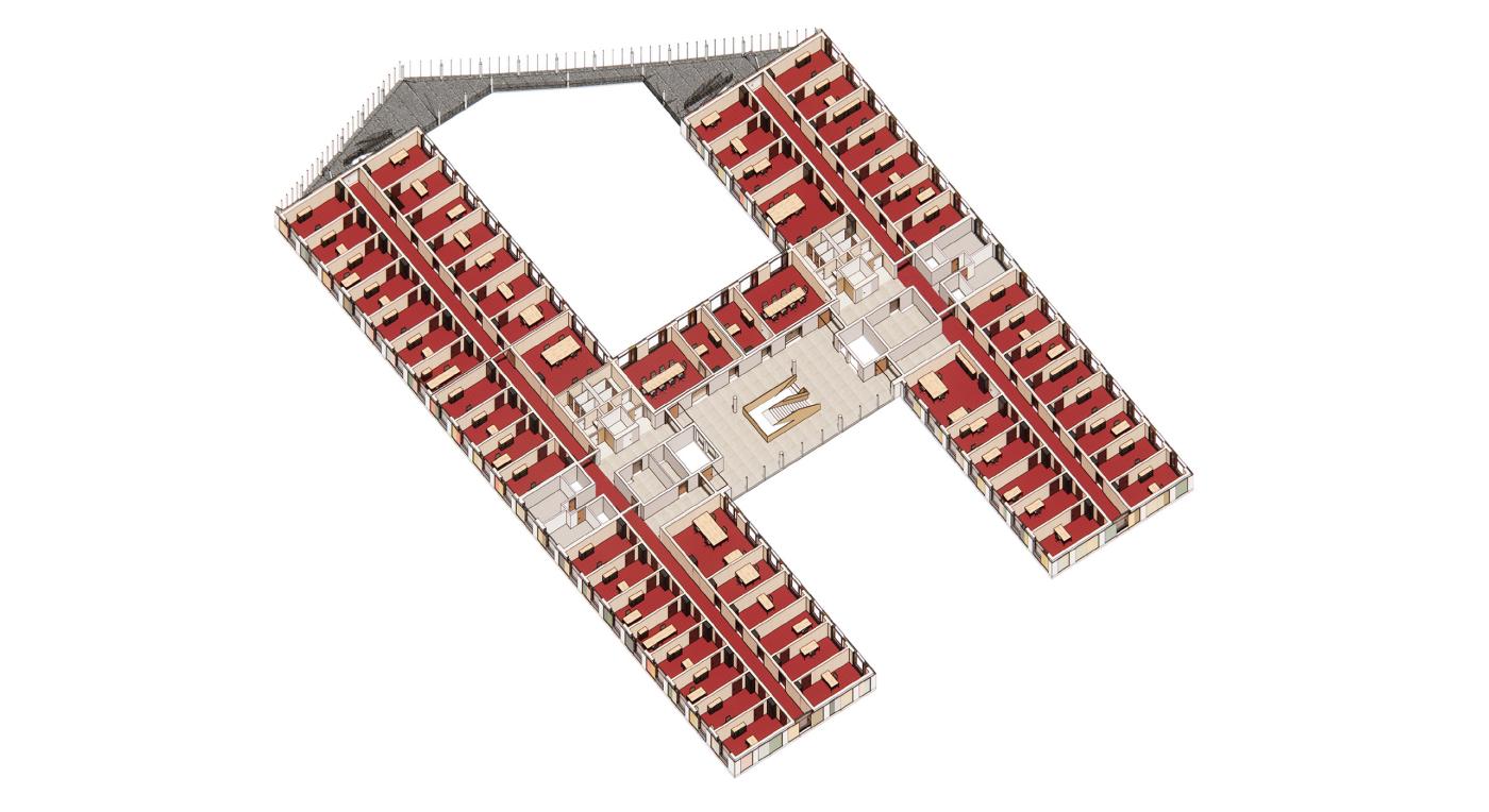 Durch die H-Formation ergeben sich zwei Gebäudeteile mit unterschiedlichen Qualitäten und ihren Höfen: der südliche Teil bietet sich als Cour d’honneur an, über den man die halböffentlichen Bereiche und die großzügige Treppenanlage erreicht. Der nördliche Teil – durch eine Glaswand gegen den Lärm der Stadtbahn geschützt - beherbergt einen grünen Innenhof, den Hauptsicherheitsbereich und die meisten der 400 Büros.