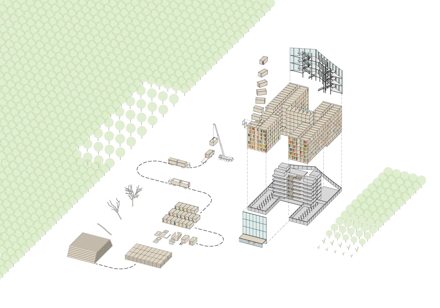 Alle Büros wurden als vorgefertigte Massivholzmodule konzipiert. Werkseitig werden Fensterelemente, ein Holzrahmen mit Wärmedämmung und integrierter Sonnenschutzanlage und eine Unterkonstruktion für die Fassadenbekleidung aus farbigem Glas in das Modul eingebaut. Lediglich die Bodenplatte, die Technikräume im Erdgeschoss und das zentrale Atrium werden in Stahlbetonfertigteilbauweise errichtet. Das Materialkonzept der Innenräume folgt der konstruktiven Logik dieser Hybridkonstruktion, die Rohbaumaterialien Holz und Beton bleiben hier sichtbar.