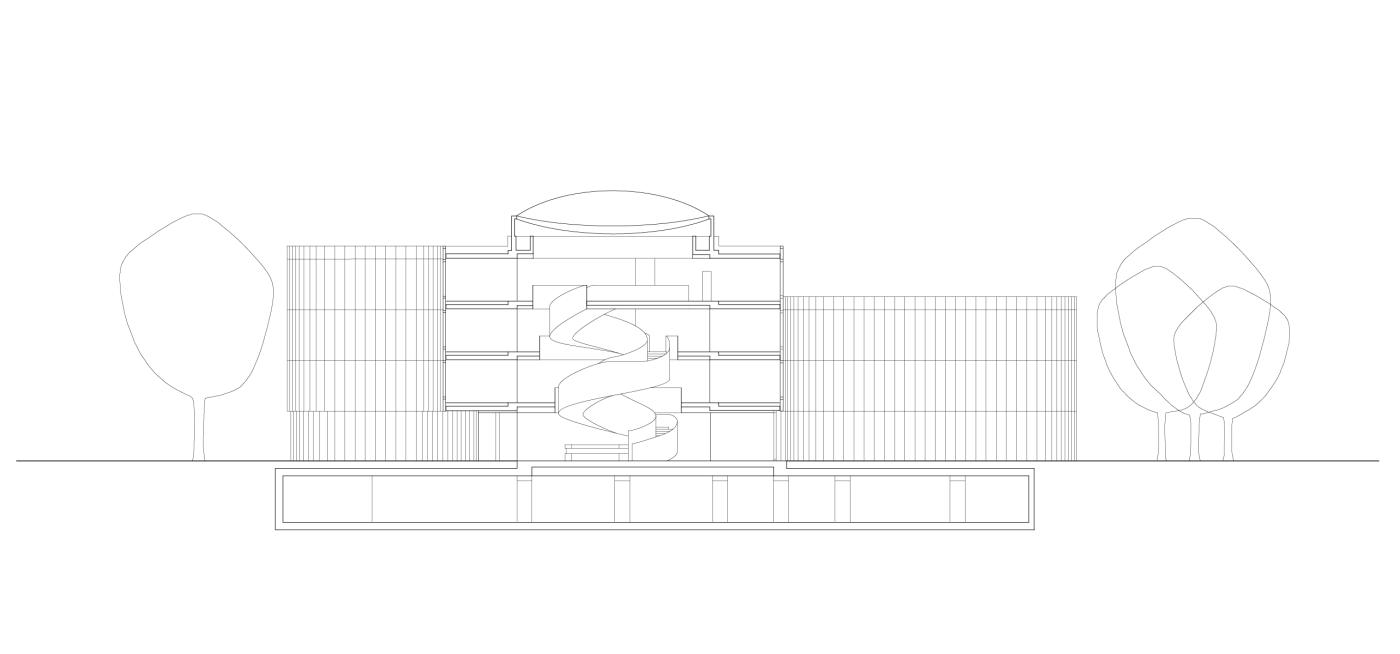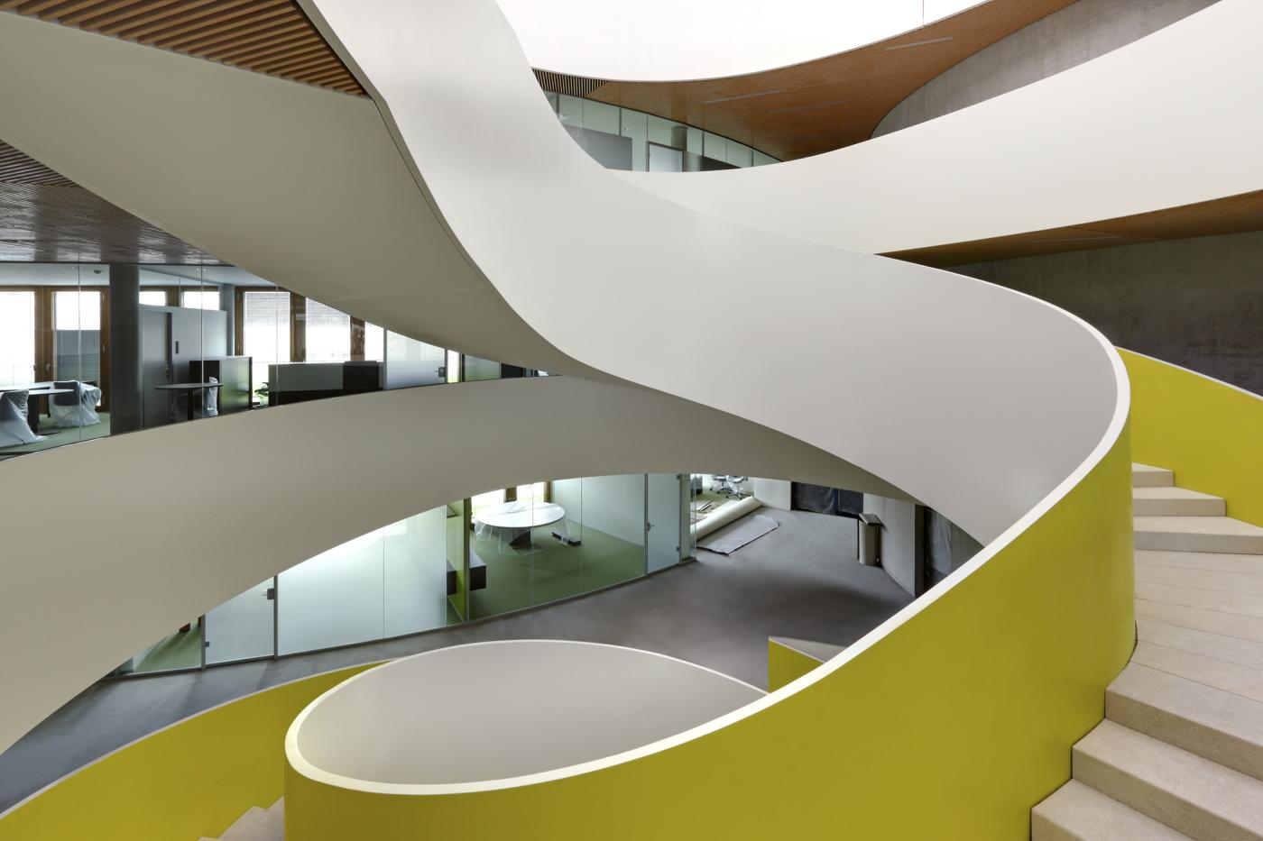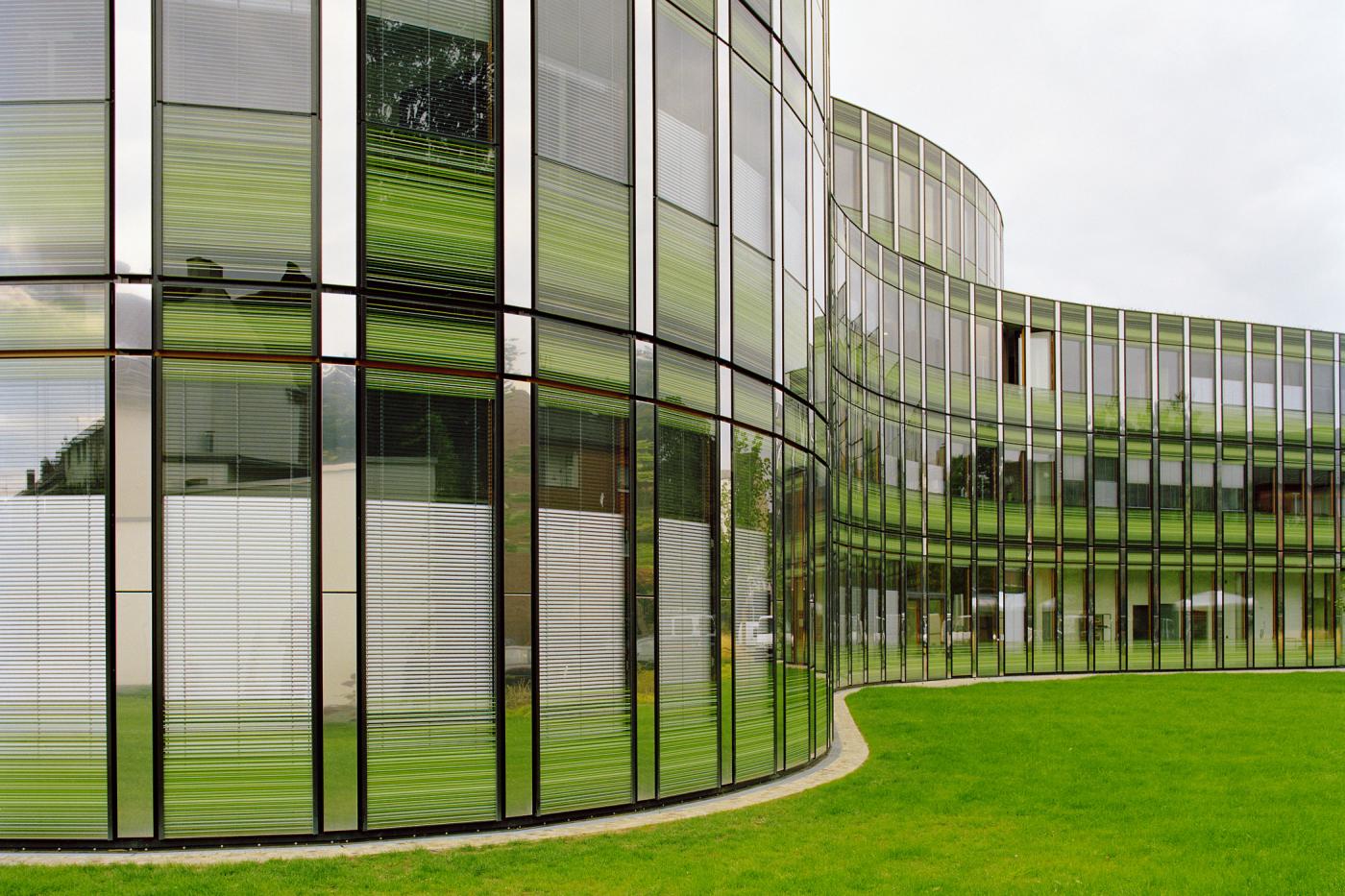 Der Aufbruch spiegelt sich auch in der Struktur und Erscheinung der Architektur. Die stark verkleinerte neue Zentrale ist nach Prinzipien von Effizienz und Nachhaltigkeit geplant. Ihre konkav und konvex geschwungenen Fassaden sind hochwärmedämmend und zweischichtig aufgebaut. Eine innere Holzfassade wird durch eine äußere Schicht vor dem Wetter geschützt, dazwischen ist reversibler Sonnenschutz platziert.
