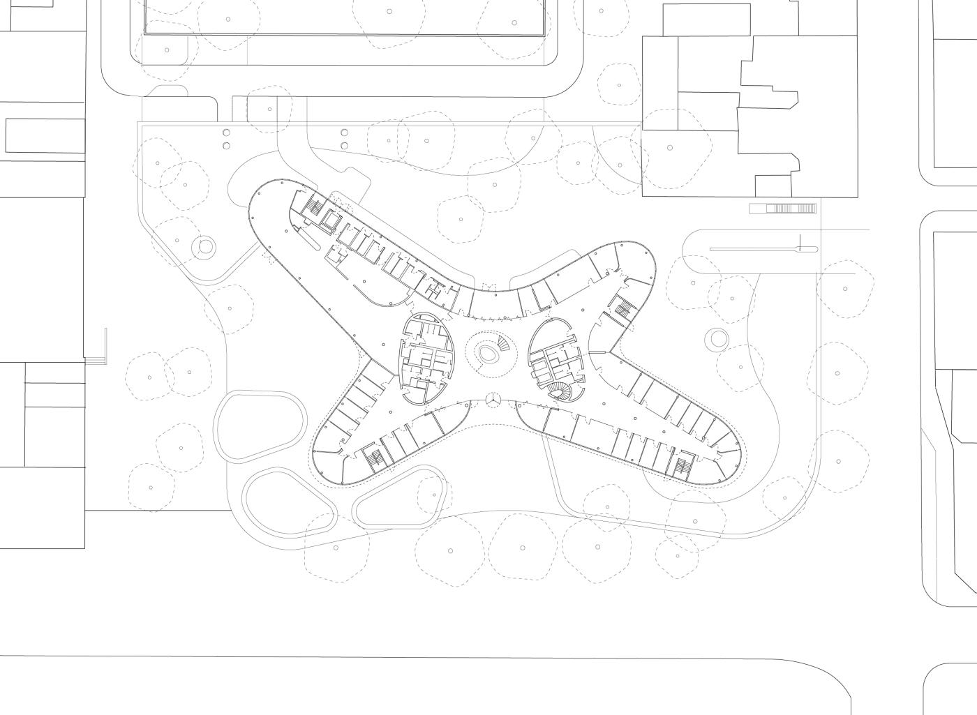 Die skulpturale Form des Gebäudes wird durch vertikale Lisenen aus poliertem Edelstahl und horizontale Bänder aus grün bedrucktem Glas akzentuiert. Seine fließenden Konturen, seine farbigen und reflektierenden Oberflächen verleihen dem Bau im Wechsel von Tages- und Jahreszeiten immer wieder einen neuen, quasi natürlichen Charakter und unterstützen so räumlich und atmosphärisch das architektonische Leitbild der Parkstadt.
