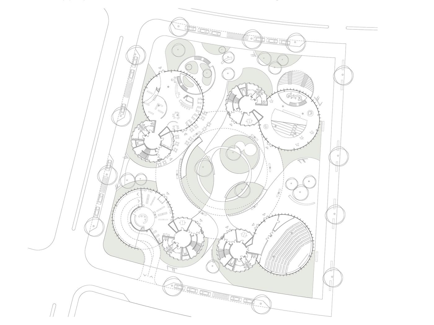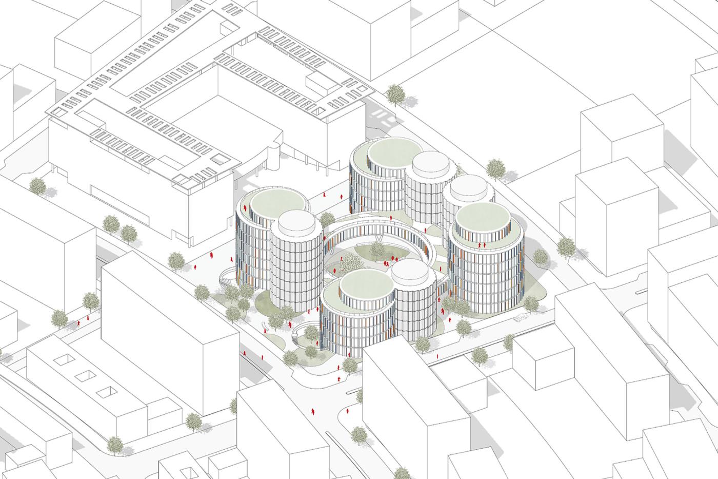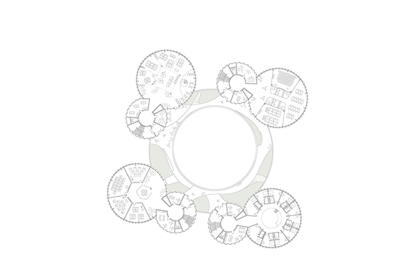 The proposal by Sauerbruch Hutton envisages a composition of four interlocking buildings forming a cluster. The layout of each building is based on a larger circle, housing the main part of the programme, which intersects with a smaller circle where utilities and vertical circulation are located. This allows for a free division of the floor plan and thus a variety of uses: Classrooms, offices, auditoriums, workshops, etc. In addition, the radial geometry offers short walkways, high flexibility and balanced daylight exposure.