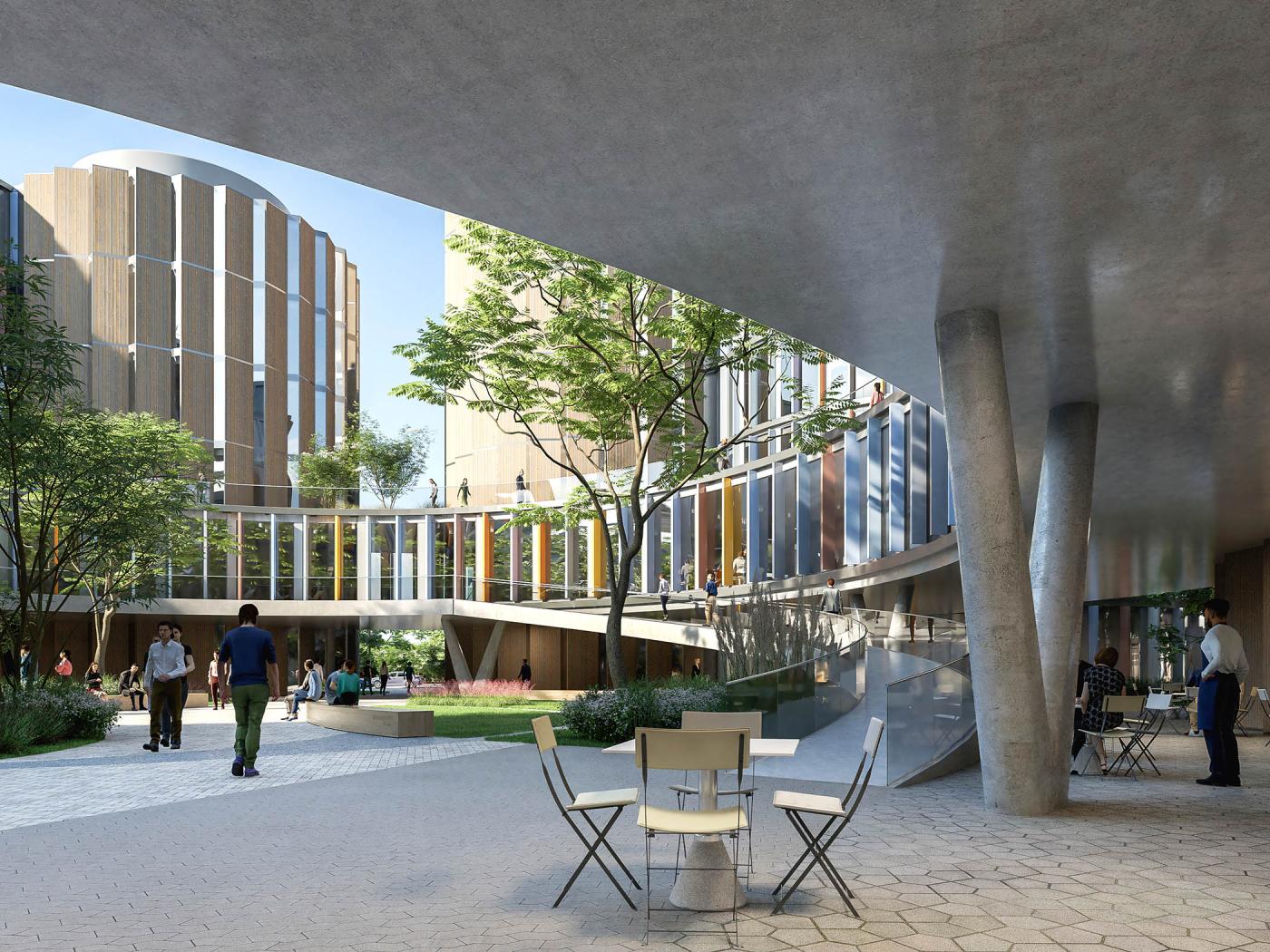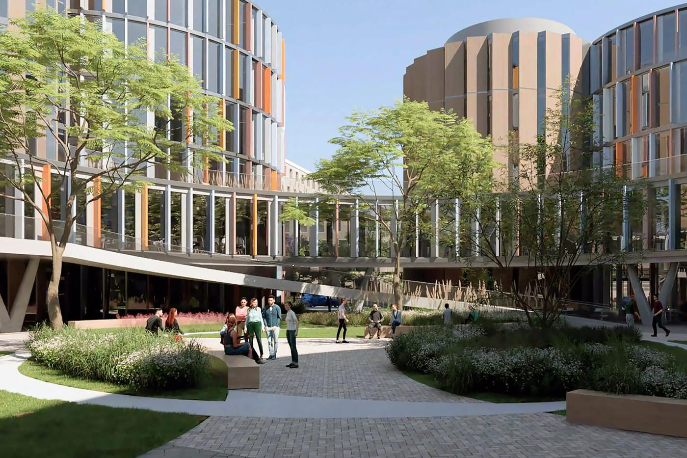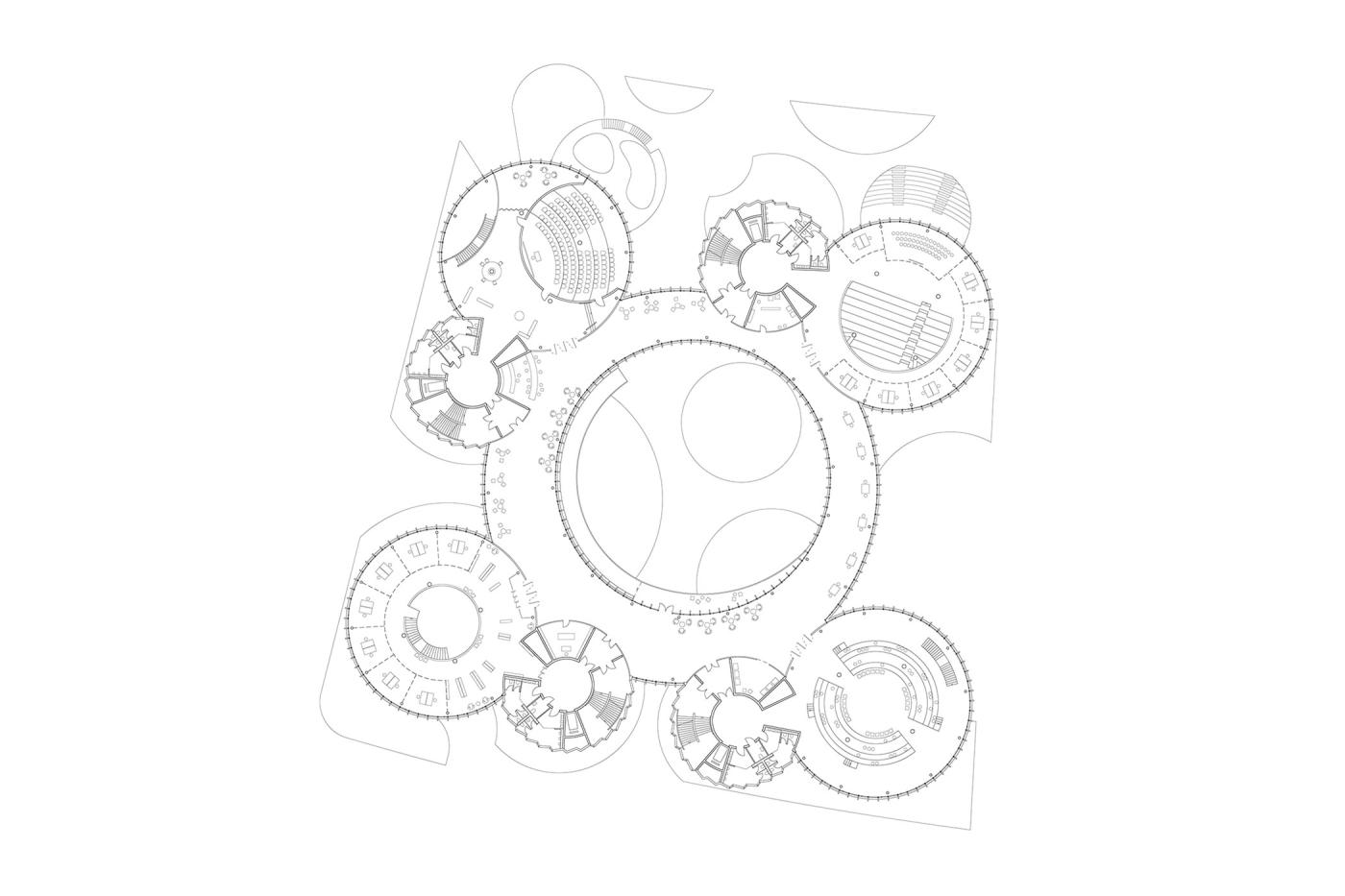 The proposal by Sauerbruch Hutton envisages a composition of four interlocking buildings forming a cluster. The layout of each building is based on a larger circle, housing the main part of the programme, which intersects with a smaller circle where utilities and vertical circulation are located. This allows for a free division of the floor plan and thus a variety of uses: Classrooms, offices, auditoriums, workshops, etc. In addition, the radial geometry offers short walkways, high flexibility and balanced daylight exposure.