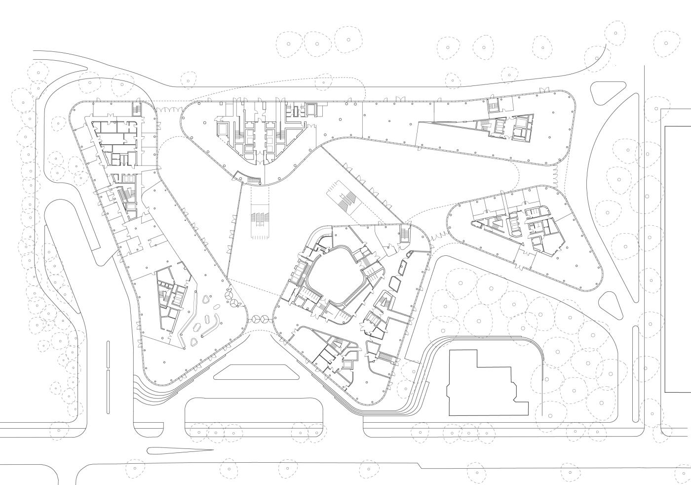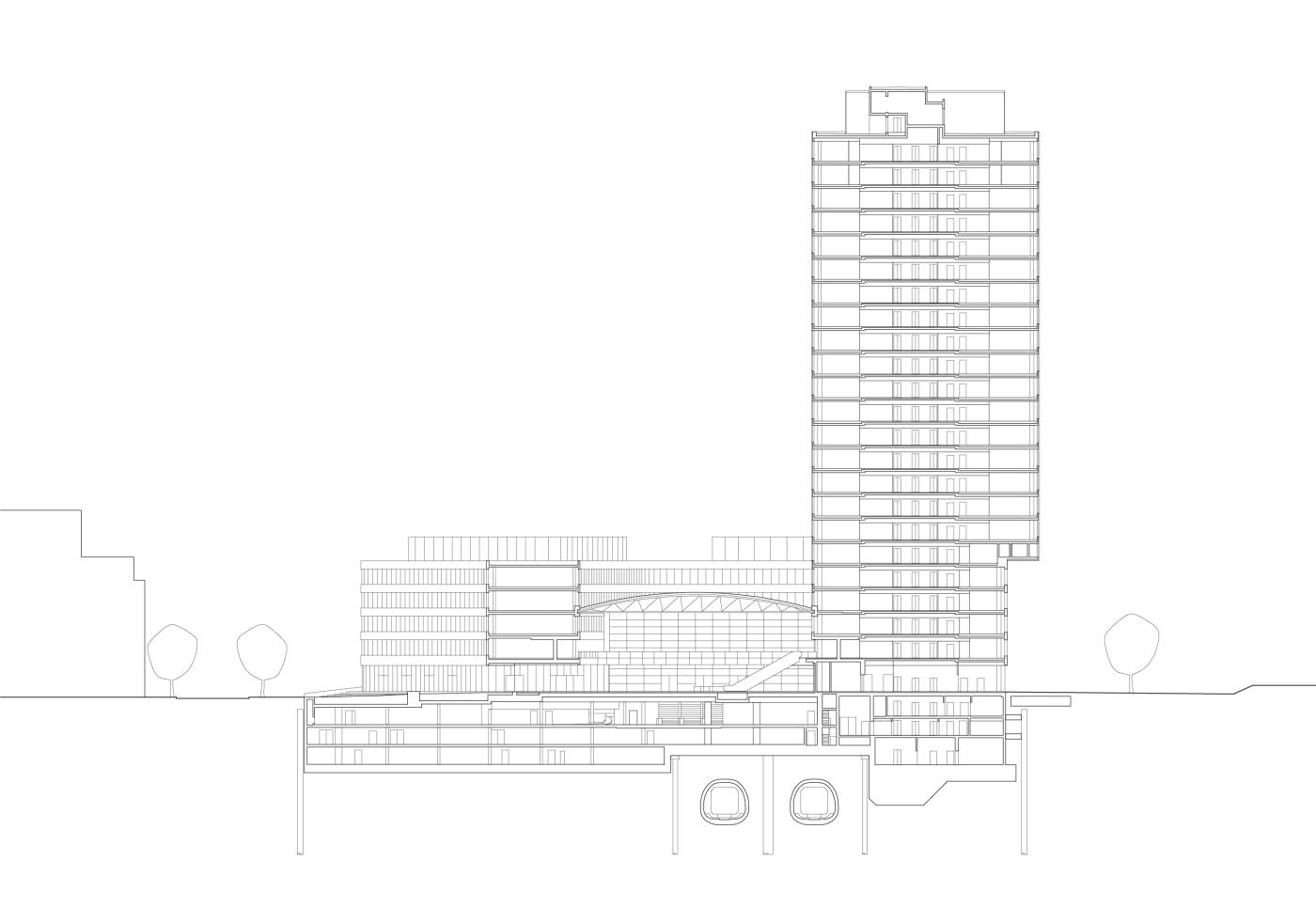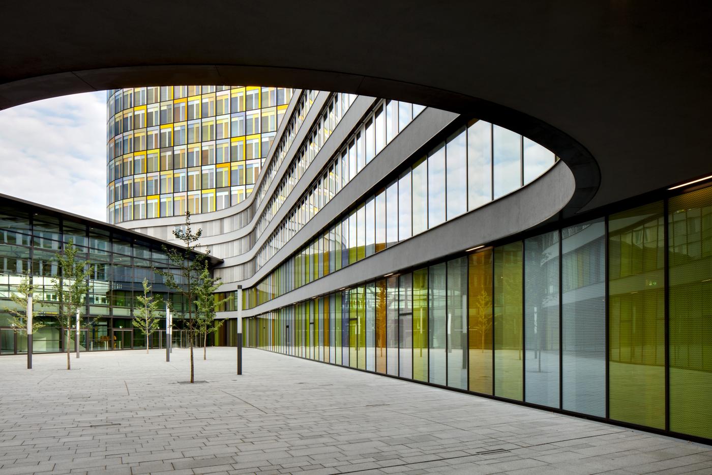 The headquarters’ five-storey base responds to the scale and grain of the surroundings. Its dynamic five-pointed ‘starfish’ form creates a generous courtyard as well as outdoor spaces of specific character. These include the entrance driveway and an area of open landscaping that frames a neighbouring listed house. The eighteen-storey tower situated to the north serves as a landmark that punctuates the linear space of the railway tracks. The various routes towards the building converge at a large glazed foyer in the courtyard, which gives access to a ‘ring road’ on the first floor. Elevating the internal circulation in this way allows the ground floor to be given over to communal uses that include a conference centre and a staff restaurant.