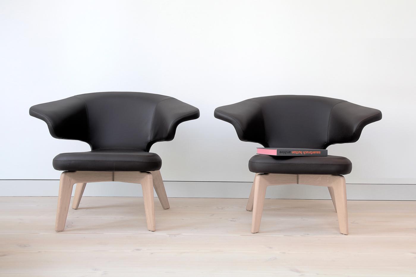 The frames are made of solid wood – oak or walnut – that is clear varnished or stained black, while the seats are made of polyurethane and can be upholstered or left bare. The idiosyncratic forms of the Lounge Chair and the Sofa are created by the injection of polyurethane around internal tubular steel frames. The covers are available in various types of fabric or leather.