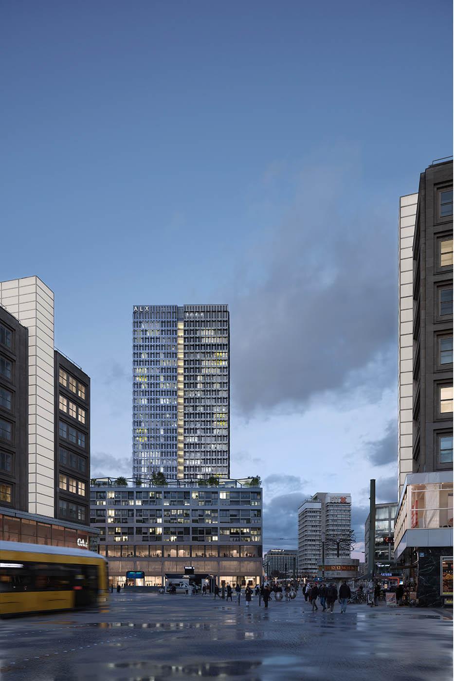 This project on Alexanderplatz combines two independent but related buildings: a plinth that corresponds to the neighbouring buildings in terms of volume, materiality and façade structure, and a high-rise that responds to the existing and planned development along Alexanderstrasse.