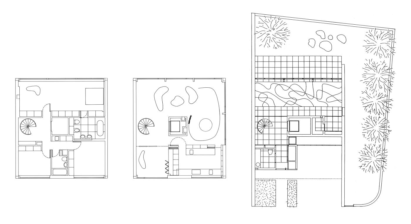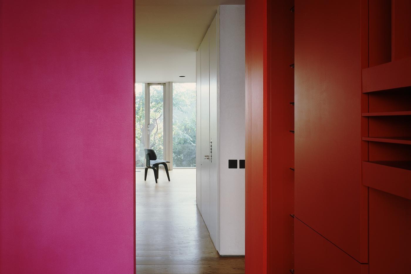 On the ground floor a matt glass screen separates the entrance area from a swimming pool, beyond which lies an exceptionally beautiful walled garden. Interior and exterior spaces are separated only by a sliding glass wall. The first floor offers an open plan with floor-to-ceiling glazing on two sides. Furniture-sized objects in various vivid colours serve as storage for the paraphernalia of everyday life; they also create a (partially reversible) separation between the space of the kitchen on the one hand, and the study and the living and dining areas on the other. On the top floor the strongly hued spaces of the bedroom and guest apartment offer a private, sensual and luxurious world.