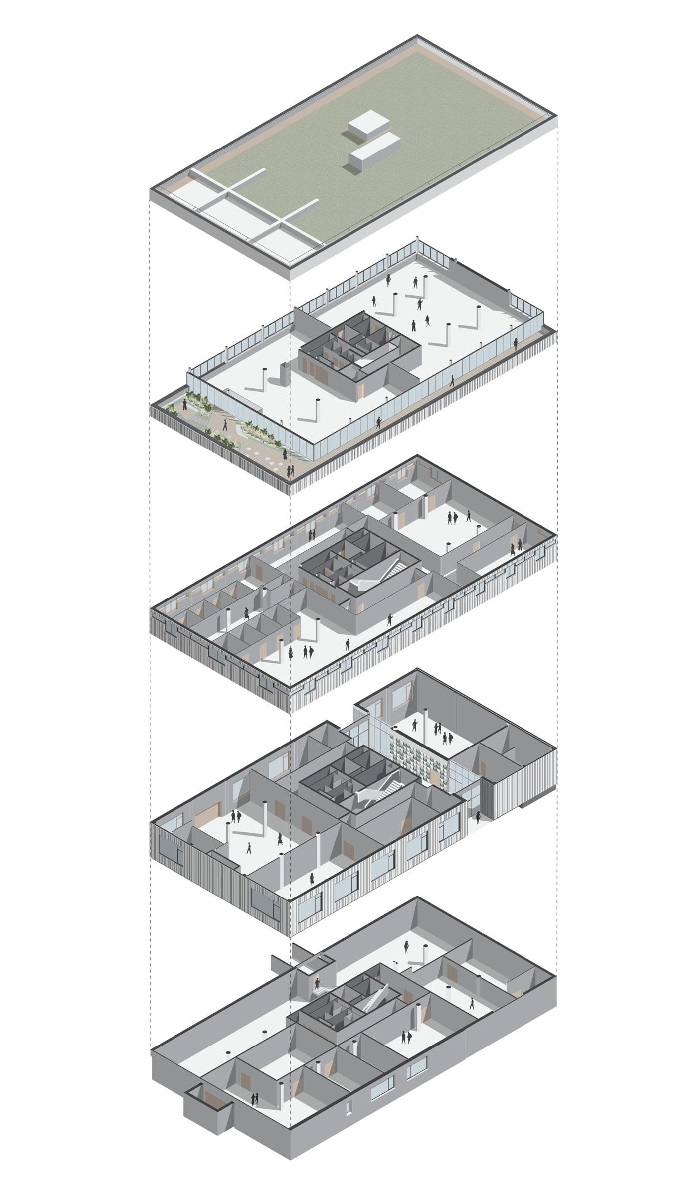 The programme combines several departments that were previously spread across the site: Prototyping, Electrical, Environmental and Materials Testing and Metrology, complemented by spaces for co-working, staff and visitors. Thus, the project embodies the company's collaborative approach and promotes the dialogue between research and practice. A compact core and load-bearing façades allow the floor plans to be organised freely, according to use and the required equipment. The architecture's flexibility creates a dynamic working environment that adapts to the changing needs of production.