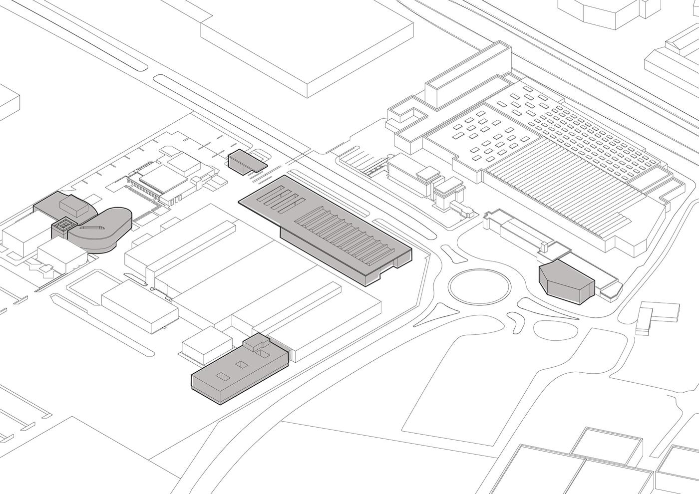 Located directly at the entrance to the company grounds, the Taranis project marks the latest building block of the Hager Campus. An extension of the existing Research & Development building, it acts as a showroom, allowing customers and visitors to observe and run testing procedures. With its monolithic volumetric form, the building responds to the prominent location and the inward-facing program. The metal façade adopts the materiality of the Forum, yet reinterprets it in texture and detailing.