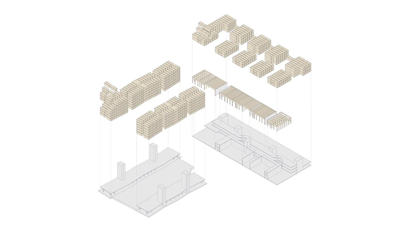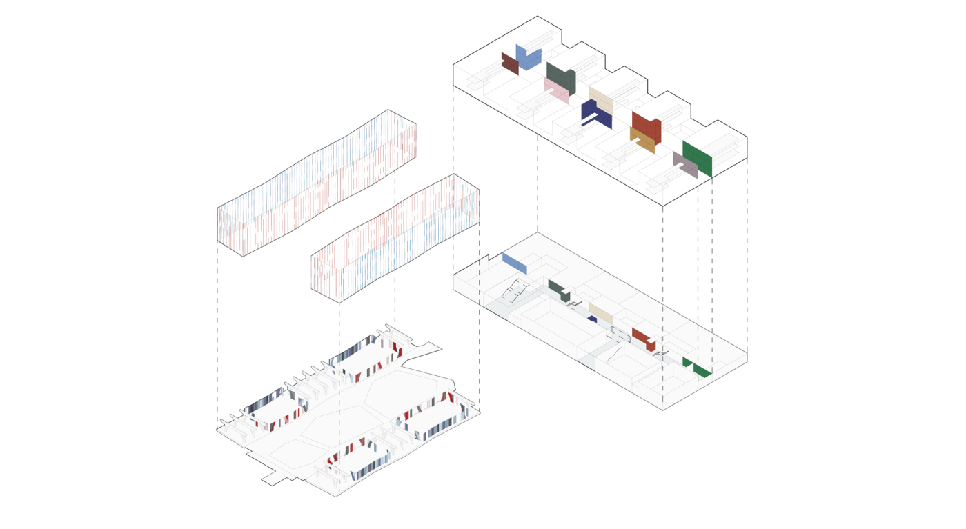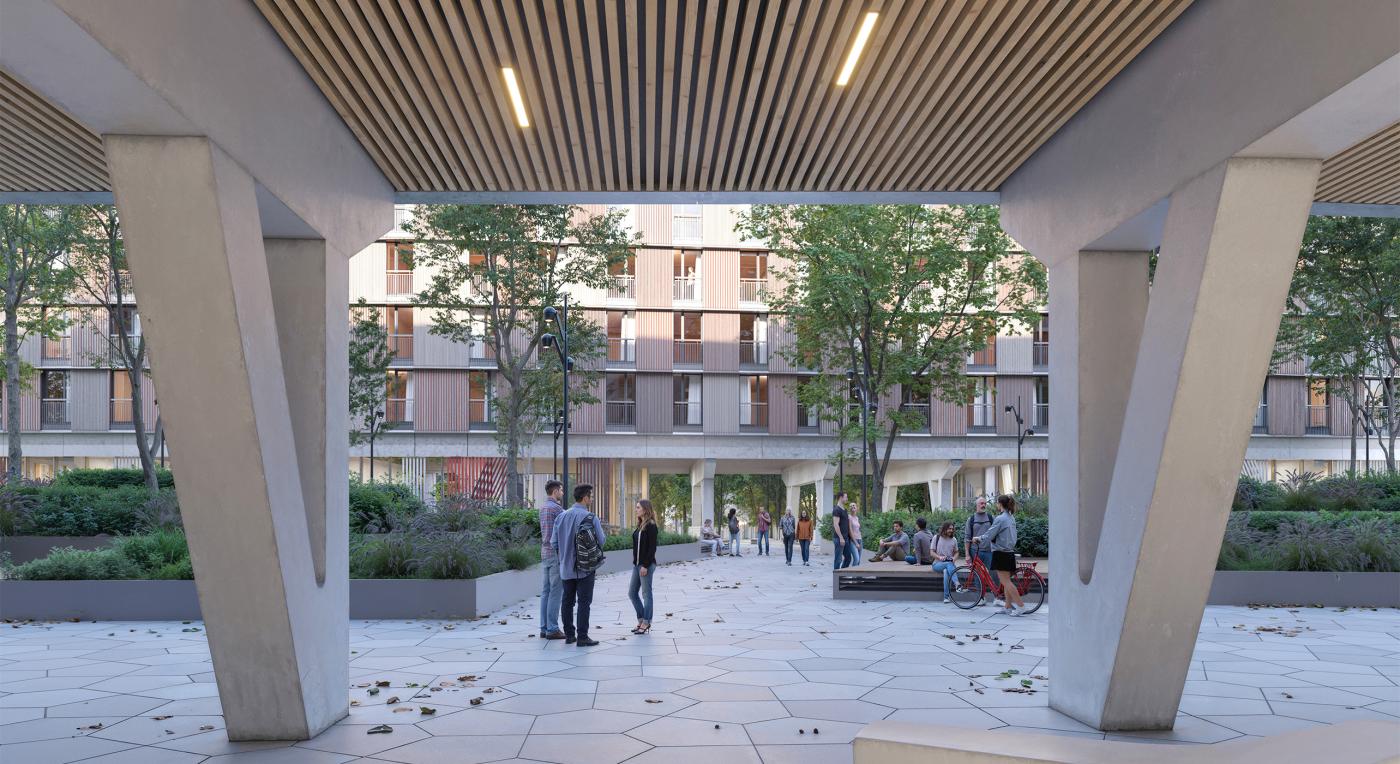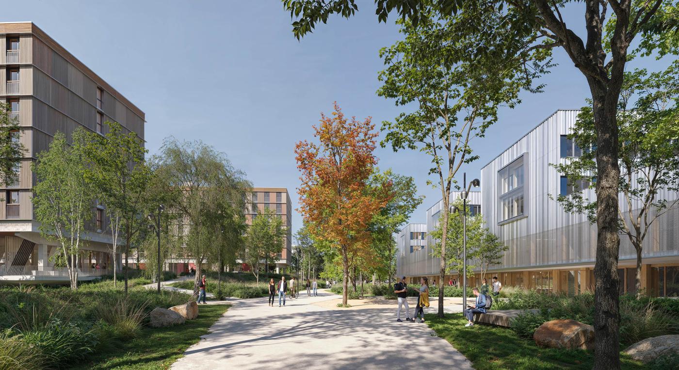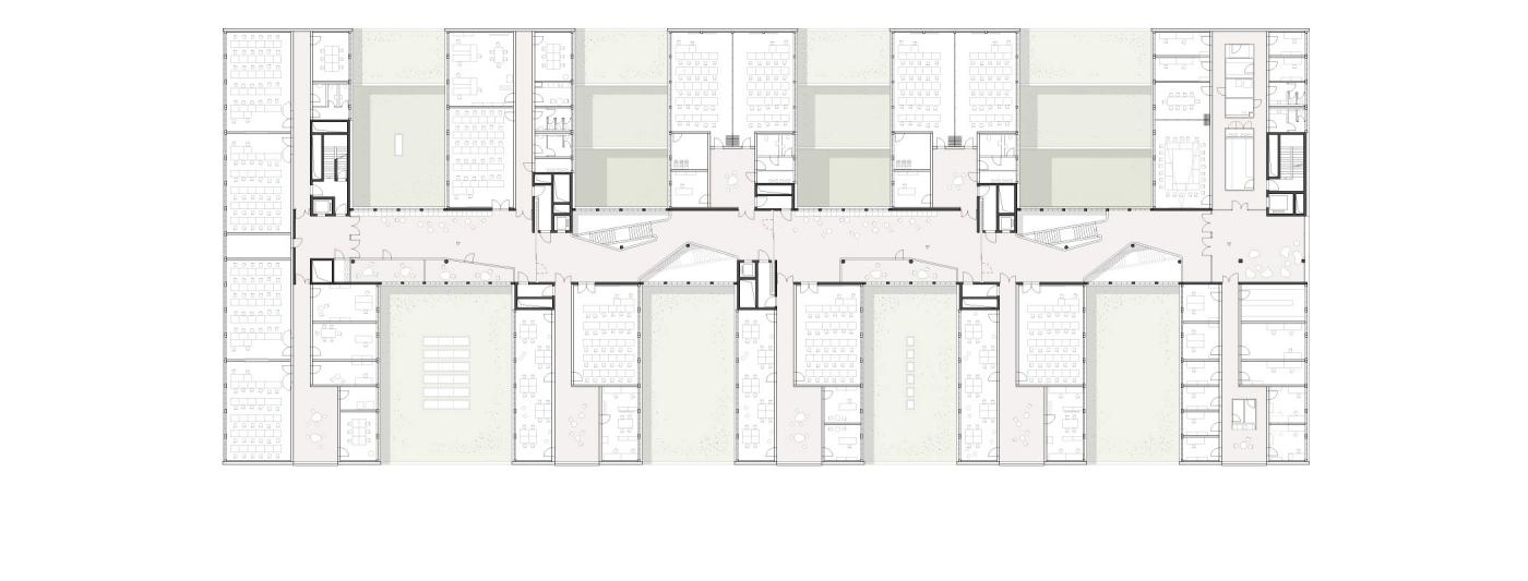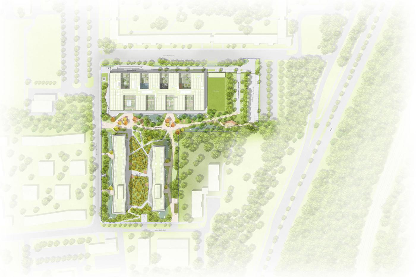 Three elongated volumes frame and condense a public park, creating two main areas, each with a character of their own: A raised garden plateau between the two residential blocks for the students and a ground-level green centre in front of the university building, which, situated under old trees, offers gathering places for leisure, sport and learning to the whole neighbourhood.