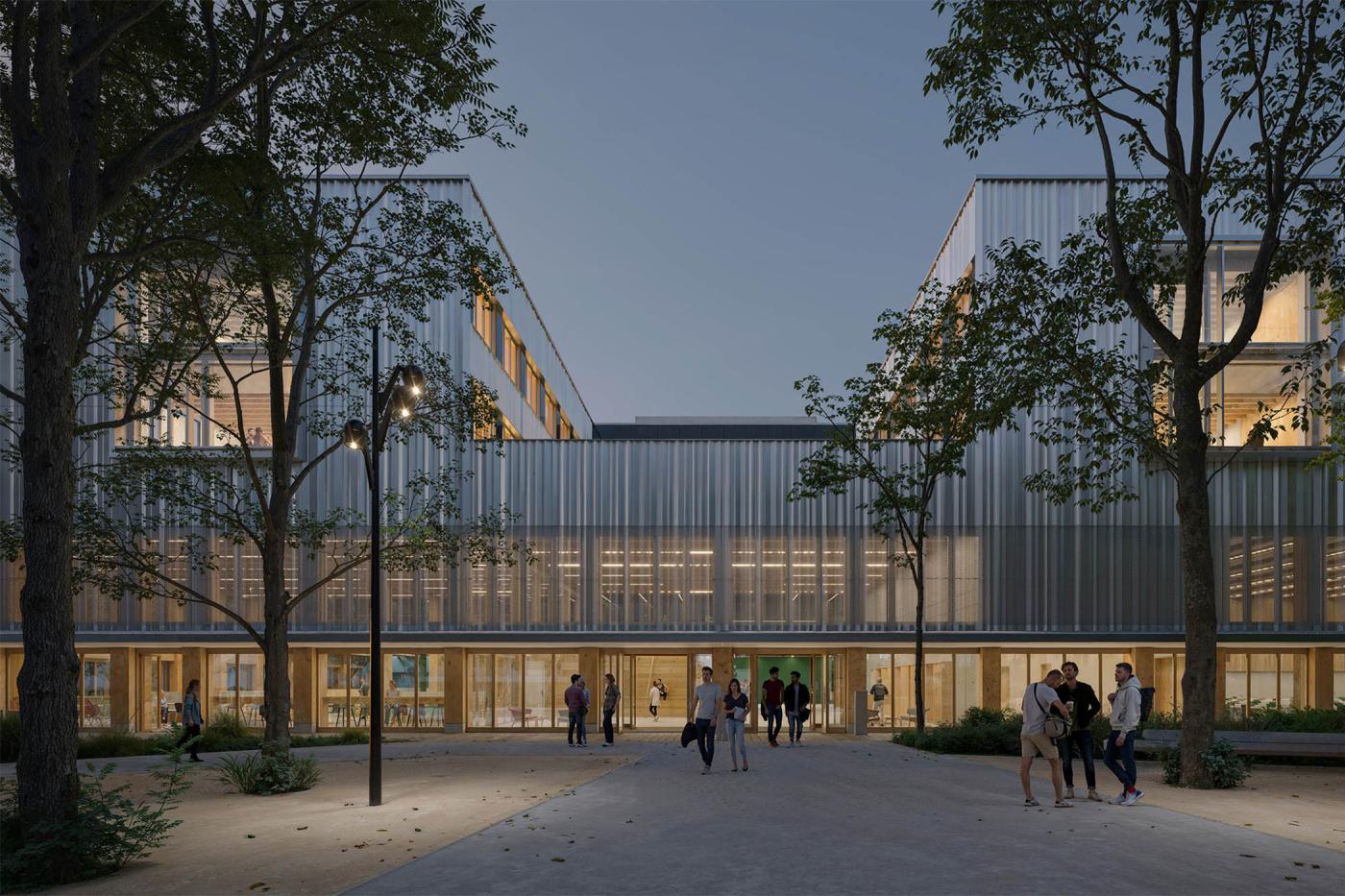 The 130 m long university building, conceived as a "groundscraper", encloses the campus to the north. The defined spatial edge is softened on the upper floors by alternating pavilions and courtyards, while the ground floor façade remains transparent and offers views into the building's facilities from a sheltered walkway. Internally, the building is organised along a four-storey circulation route that links the classrooms and administrative offices of the various faculties as well as the many other functions of a modern educational institution. Designed as a generous, naturally lit circulation space, this internal street creates a variety of additional shared areas for self-organised learning.