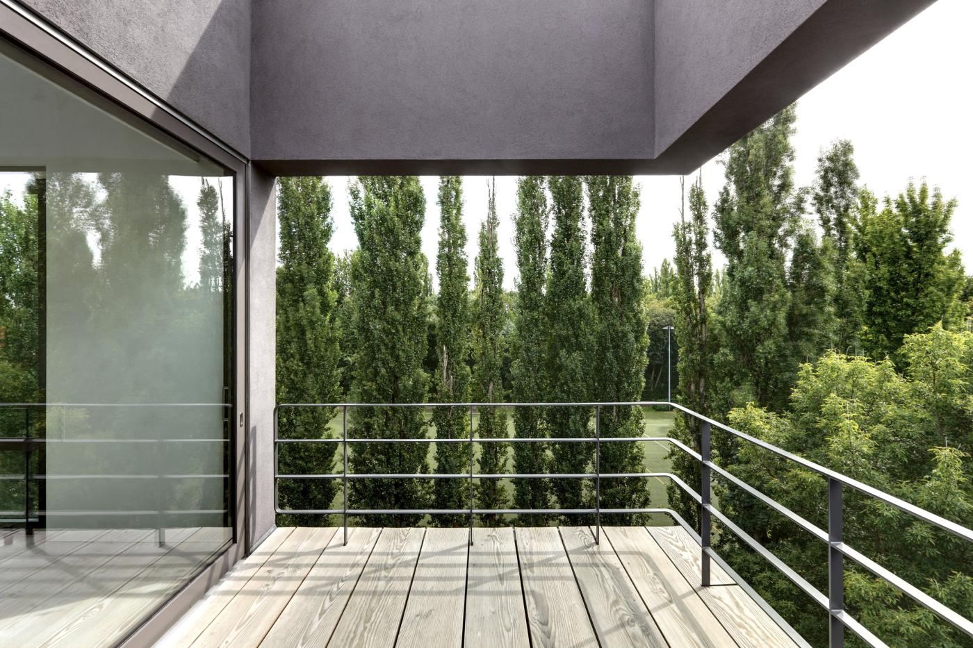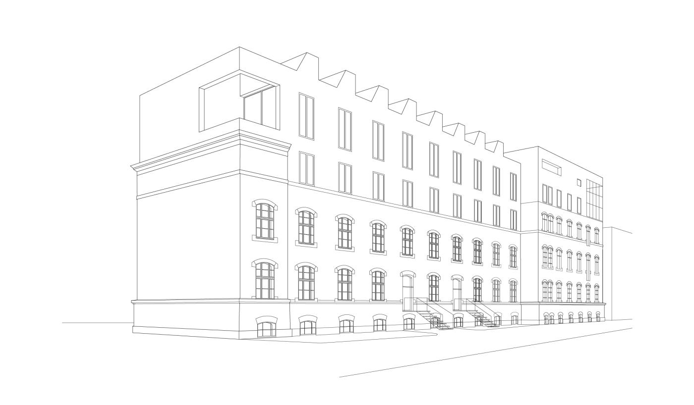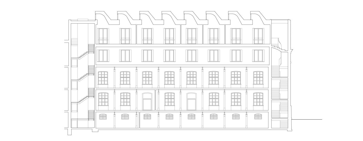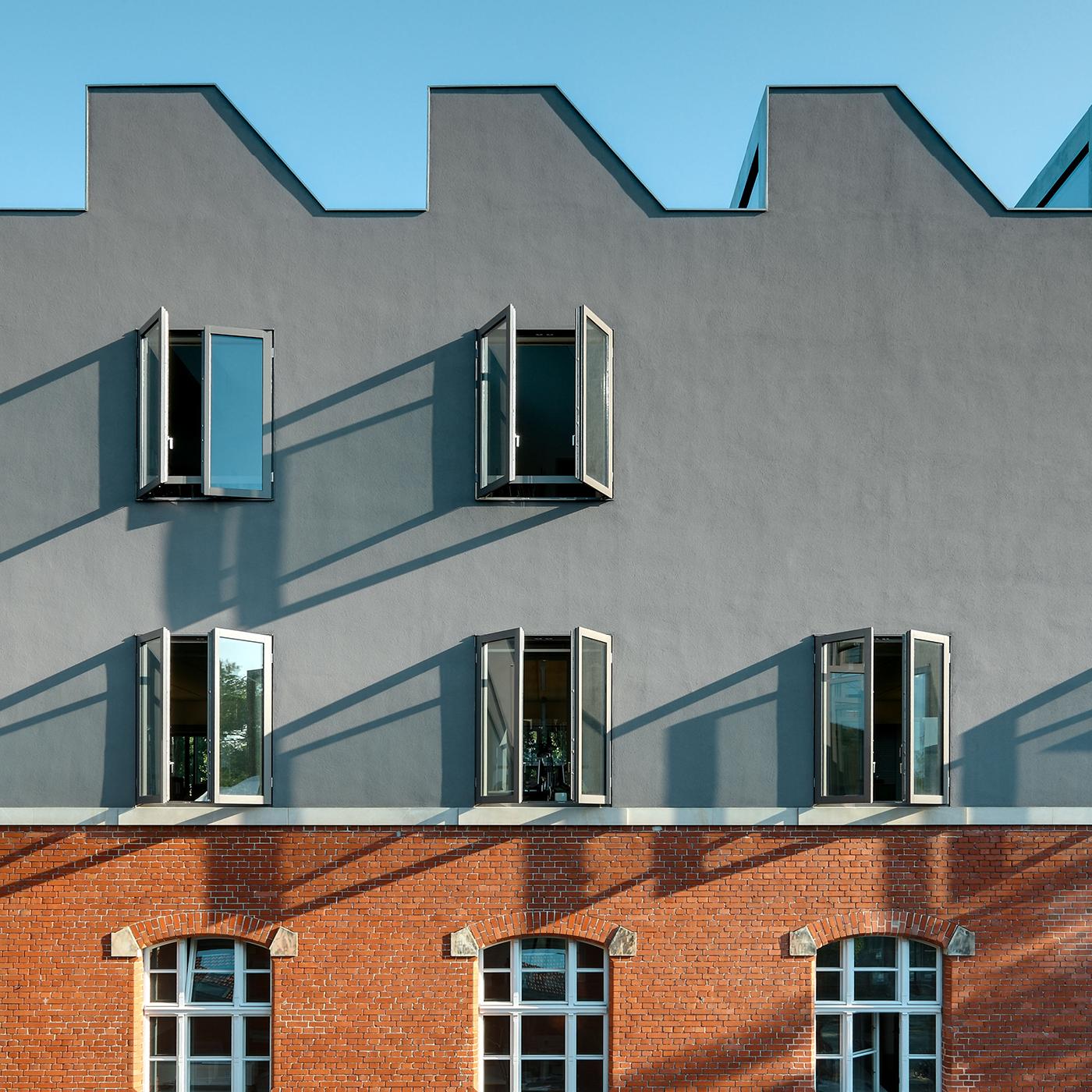 The project involved the complete renovation of the second floor – which had been haphazardly reconstructed in the wake of war damage – and the addition of a third floor. While the colour, material and detailing of the upper façade, with its blue-grey plaster, flush-set windows and zigzag silhouette, are in deliberate contrast to the base of the building, its rhythmical articulation derives from the lower portion’s listed brick façade.