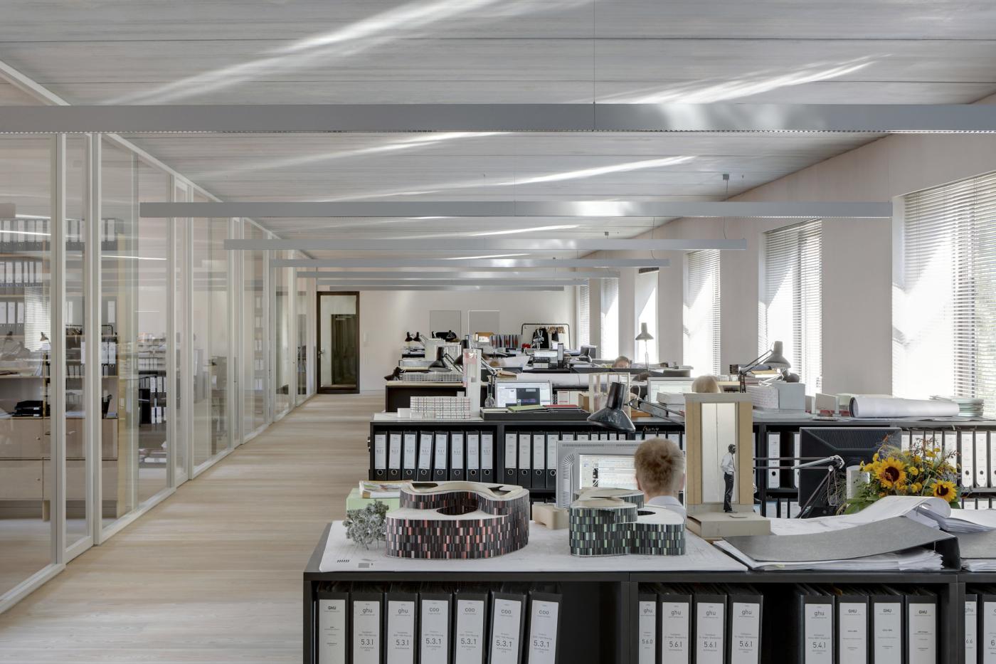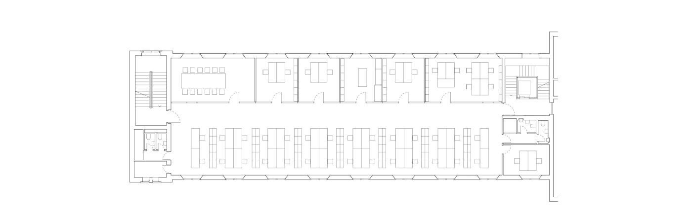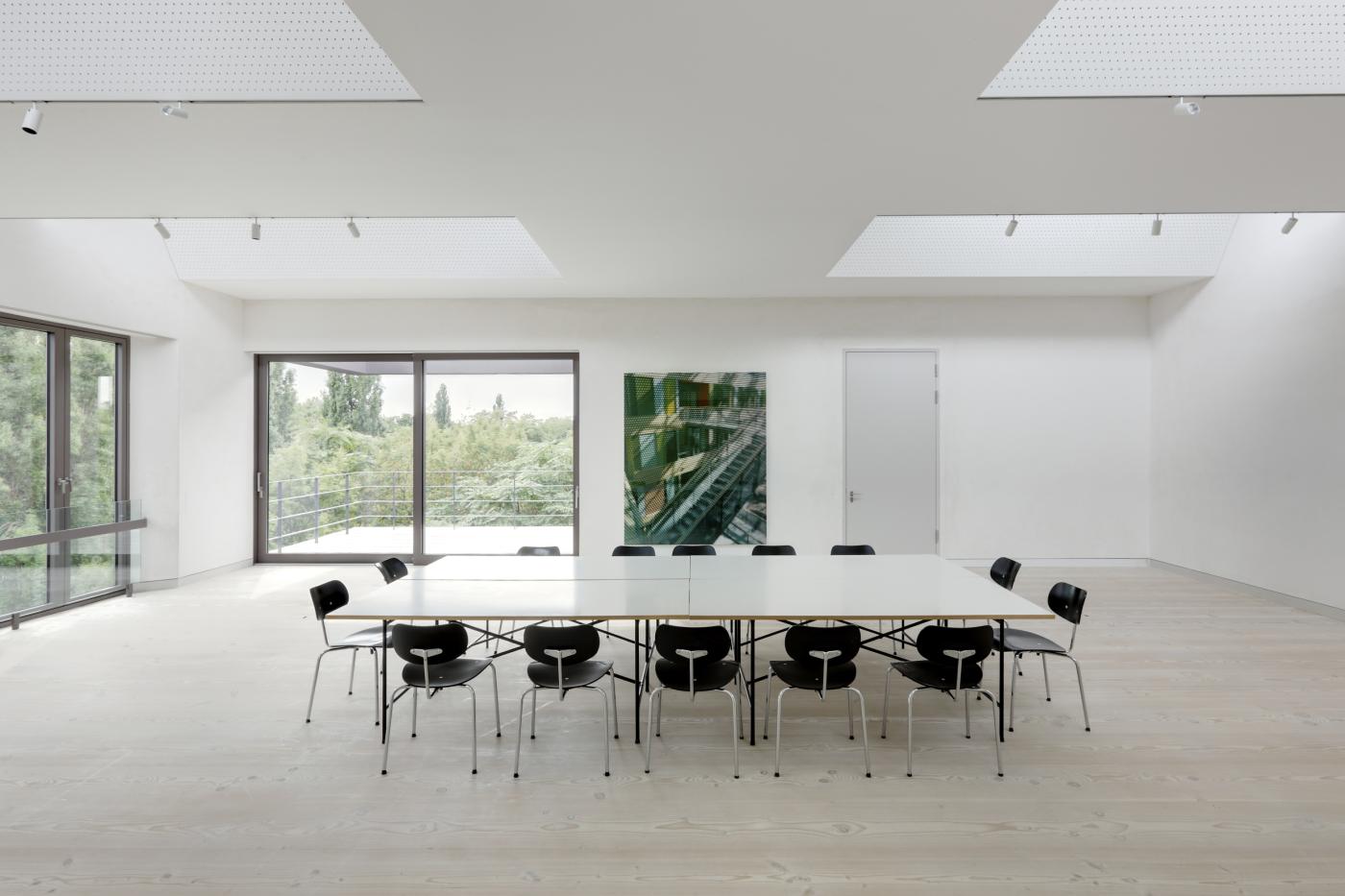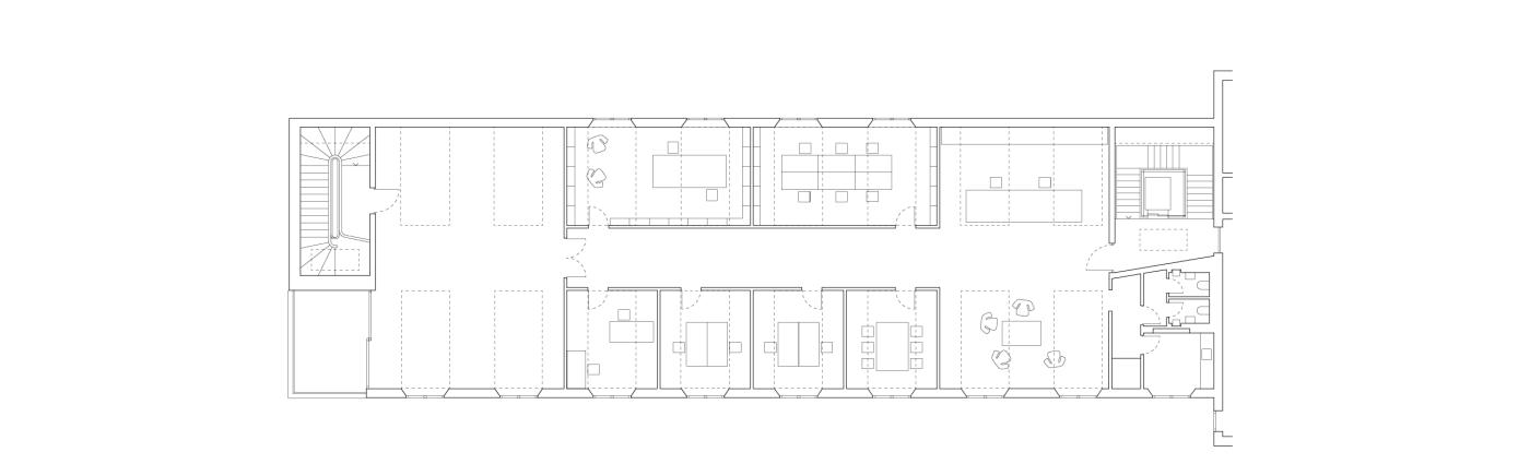 Inside, on the refurbished second floor, a long glass wall runs the full length of the space, delineating a series of offices to the north and a generous open-plan area to the south. In contrast, the new third floor has been divided laterally. Here a pair of 90 m2 loft-type spaces – one a reception area, the other a conference room – are linked by a spacious gallery that also gives access to a library and five smaller offices and meeting rooms. The spacious and airy character of this representative area is emphasised by a series of large roof lights, the off-white of the walls and the generosity of the wide Douglas fir floorboards that stretch from wall to wall. The atmosphere is both creative and professional, yet does not sacrifice the industrial aesthetic of the original.