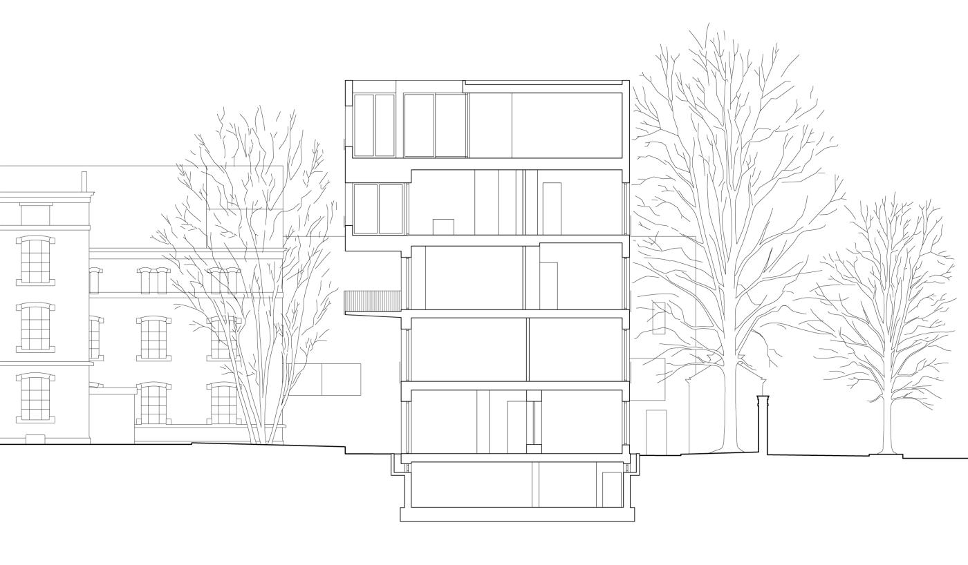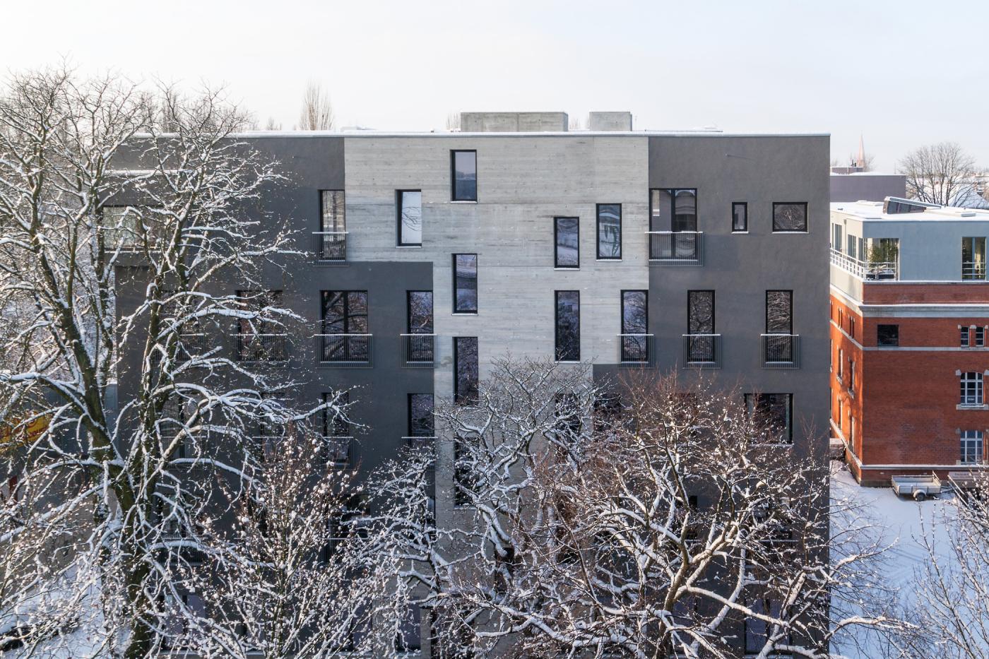 This residential building for a cohousing group in Berlin stands among trees at the edge of a dense group of buildings that were erected for the Prussian army at the end of the 19th century. The ensemble has been occupied by artists and craftspeople since the end of the Second World War, and since the beginning of the 21st century there have been various additions in the form of a large studio building and various rooftop extensions.