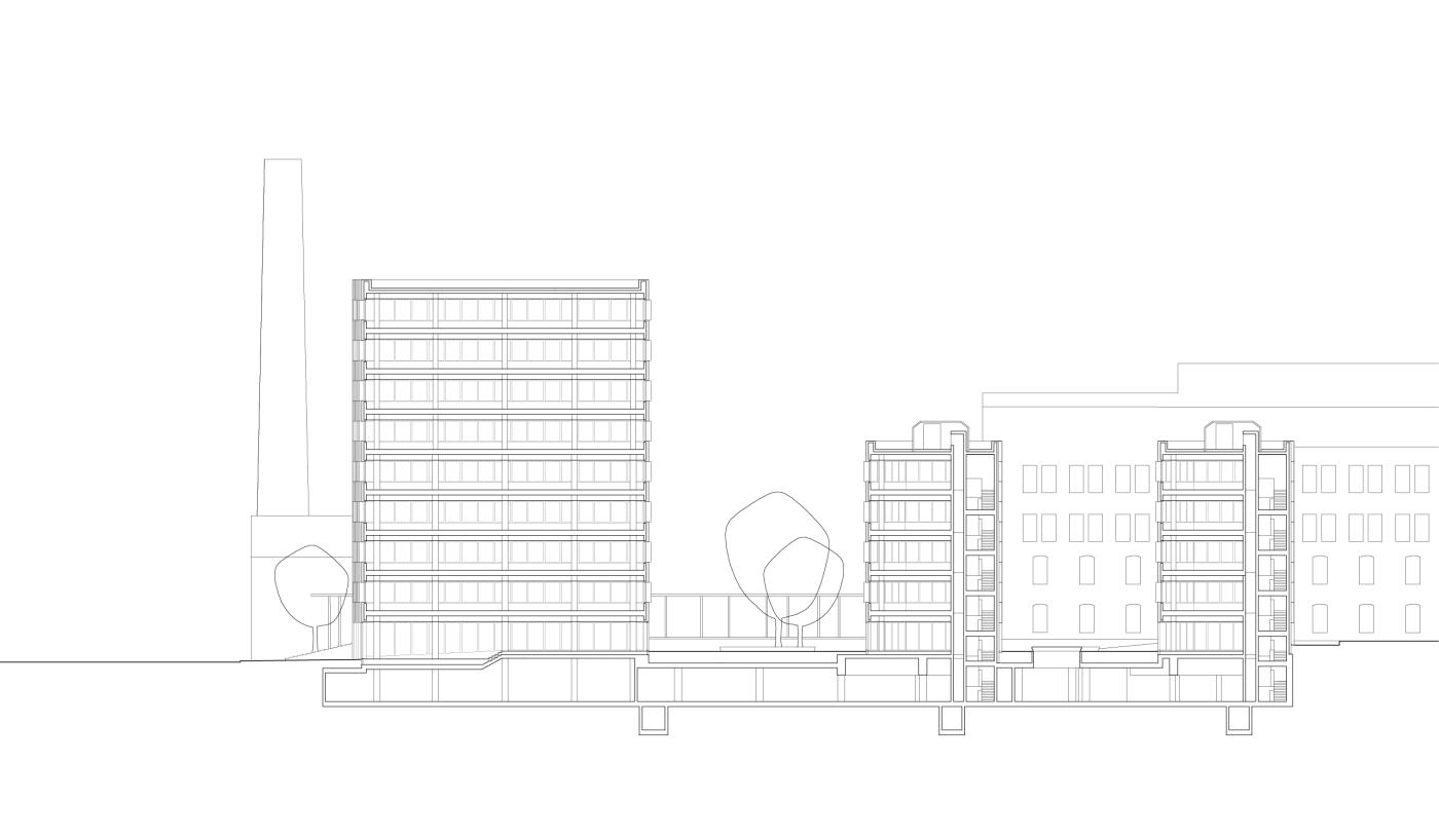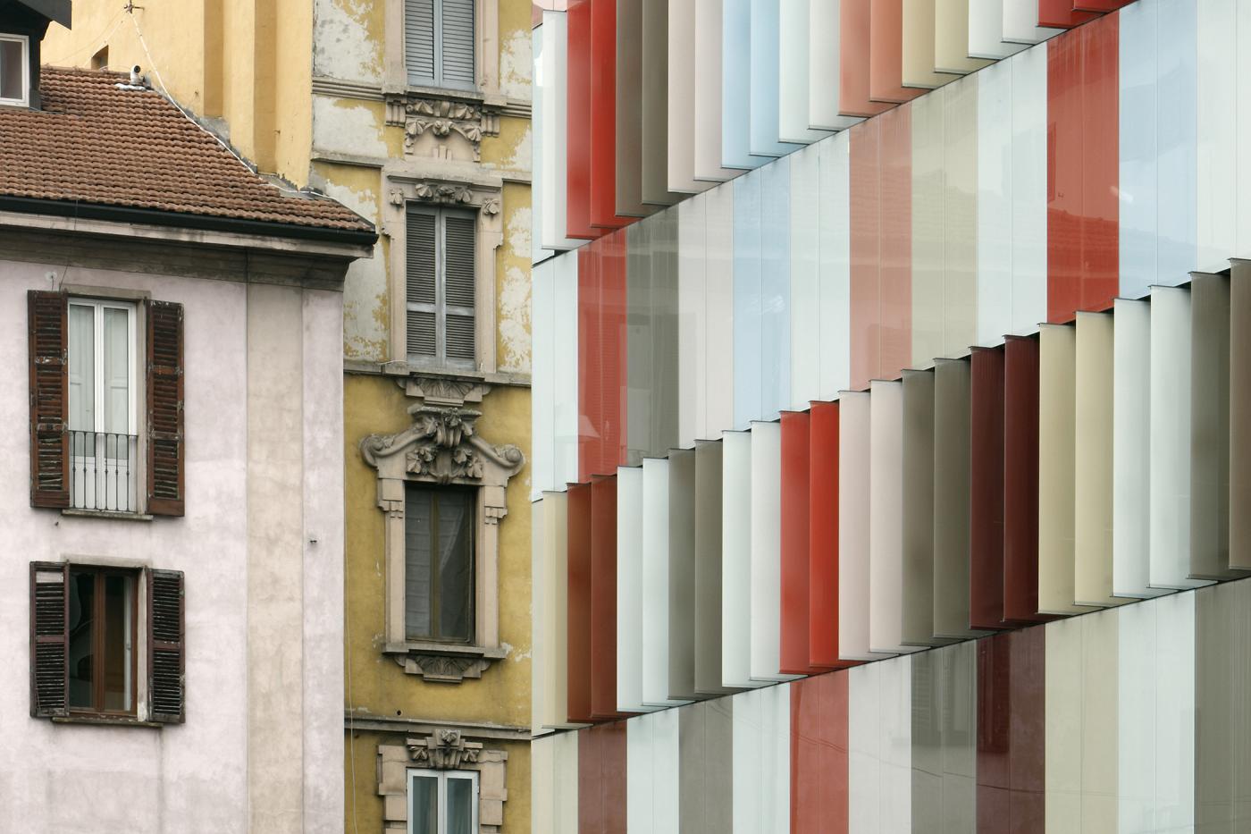 This project contributes to the sustainable revival of a former industrial quarter in the centre of Milan through the creation of well-proportioned public spaces and routes that are formed between three new office buildings. These are staggered in height to mediate the transition from the historical city block structure to a more open layout towards the rear, where a park forms the spatial and social heart of the new quarter. The buildings part to define an oblique open passage through to the park; this is lined with ground-floor shops and cafés that enliven the whole area. The two eastern buildings are connected by a glazed atrium with a staircase as its sculptural centrepiece, creating an impressive entrance.