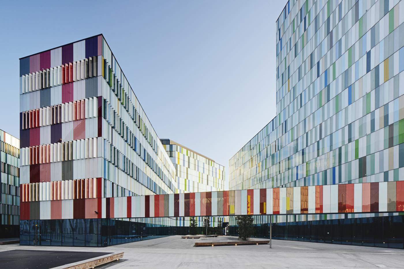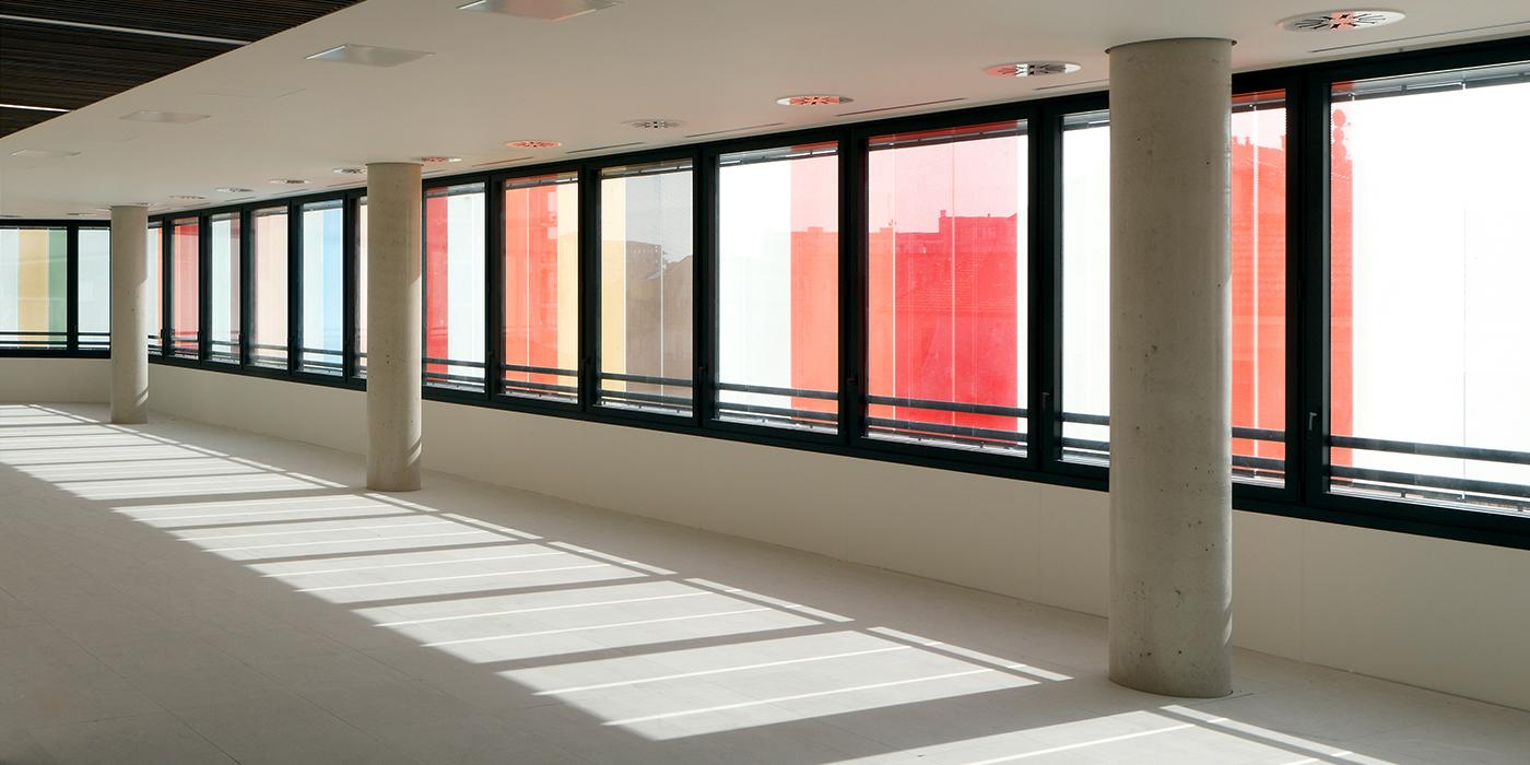 The polychromatic treatment of the façades’ glass panels – with gradated hues of warm reds and greenish-blues, set off with pale, neutral colours – creates a somewhat mottled effect that allows the new structures to integrate into their surroundings. Accordingly, the colour fields of those façades that face the park are enlarged so as to reduce the buildings’ apparent size when viewed from a distance. The colourful volumes that result yield an ensemble with an unashamedly contemporary appearance.