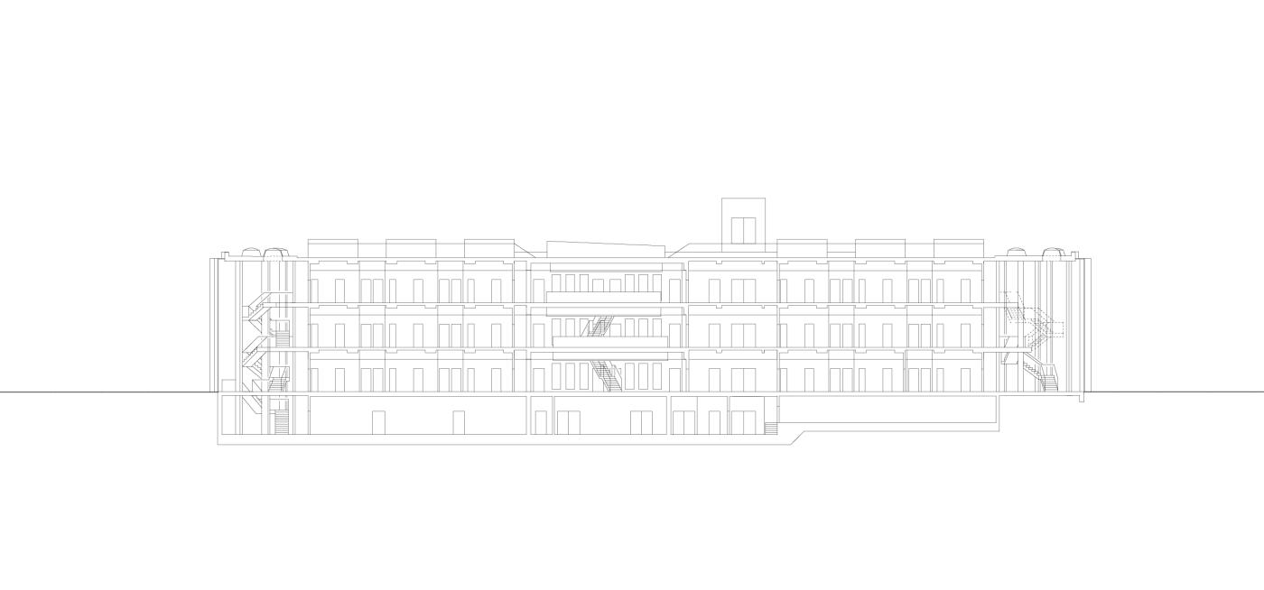 The double façade consists of an inner layer with sash windows and an outer one with fixed glazing and slot openings for air intake. Between these layers there are colour-coated solar blinds. The façade is horizontally divided into floor-height sections. Vertically it is subdivided by the twin columns. Between these concrete columns there are building-height shafts, which are open towards the air at the top; on the floors towards the façade there are cavities on either side. Thus air starts to circulate convectively and allows for the controlled natural ventilation of every floor. This double façade further offers all the other advantages typical for this type of skin: improved thermal insulation of the exterior through buffer zones, effective solar, sound and wind protection.