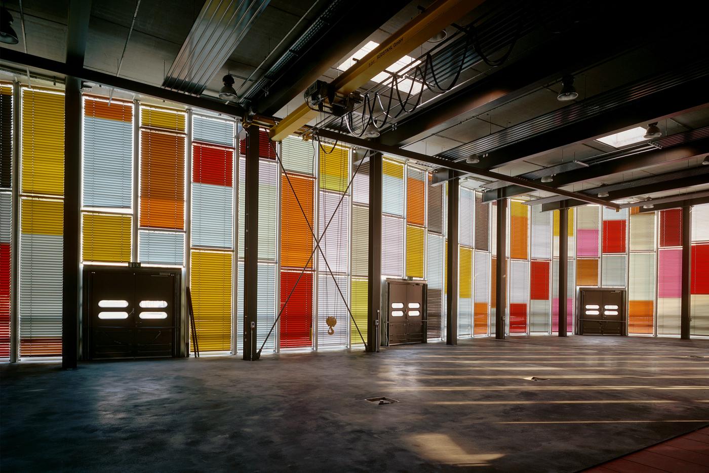 The single-storey hall is constructed as a steel skeleton: its skin consists of a full-height glass façade with internal colour-coated sunshades.