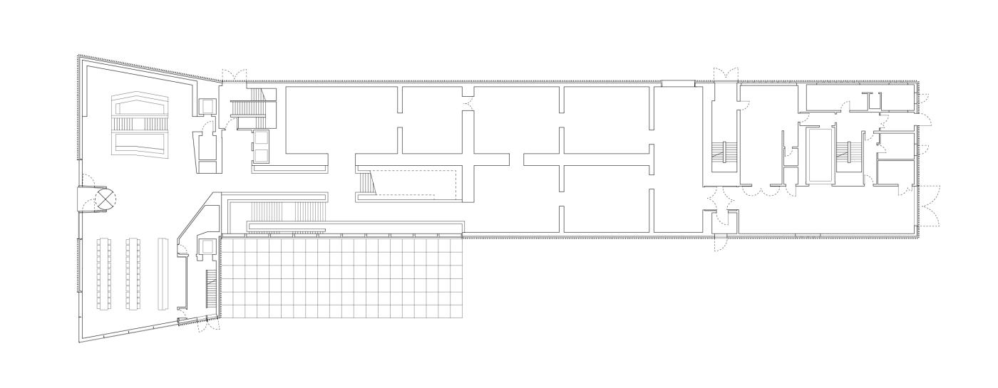 In the tradition of Munich’s other public galleries, almost all of the museum’s rooms are illuminated by daylight – even on the lowest floor. At basement level, the floor space is offset in plan so that the patio can receive light directly from above. On the ground floor, an innovative system of prismatic reflectors directs zenith light into the galleries through an asymmetrically placed clerestory, providing an even level of illumination.