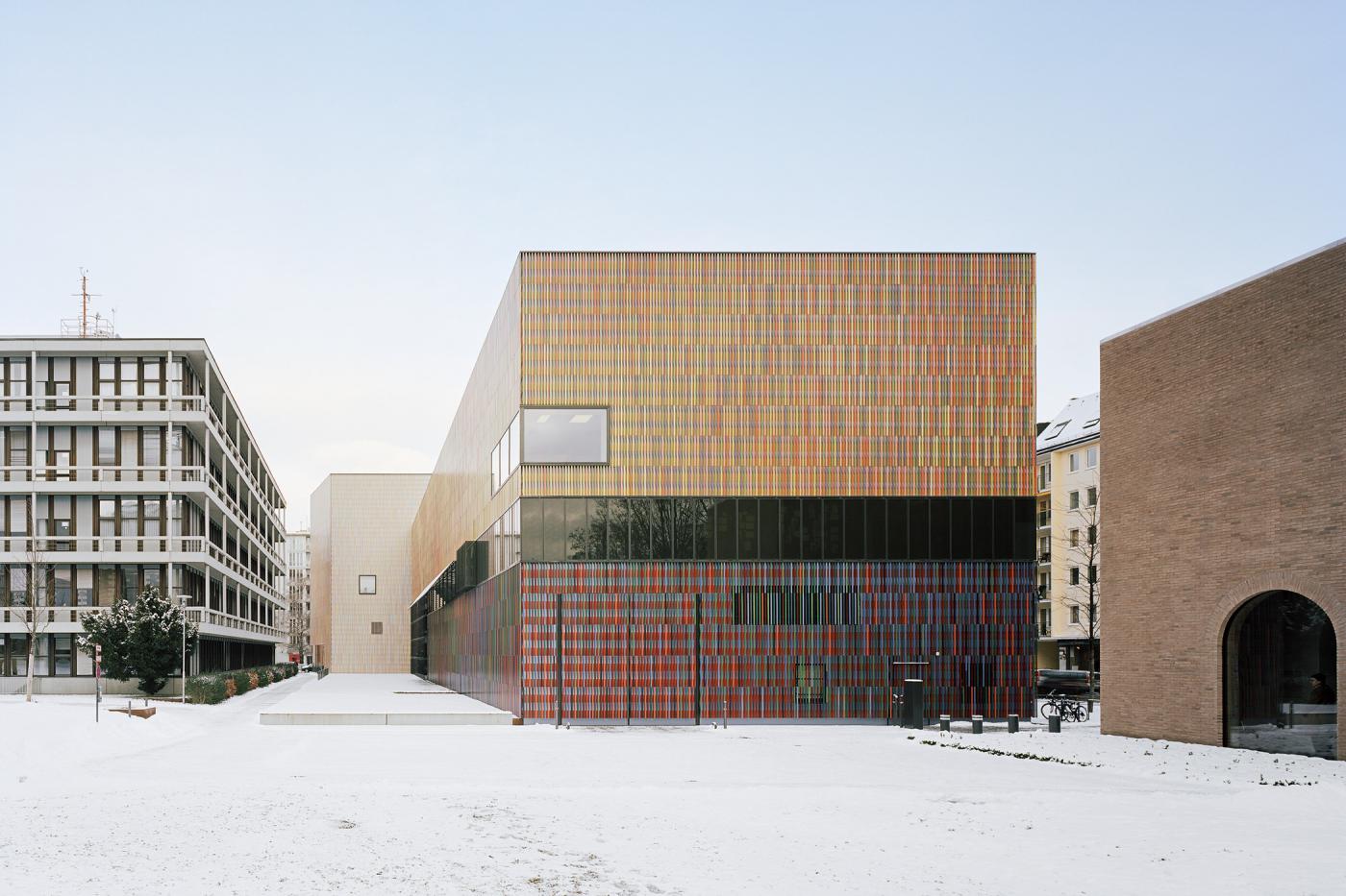 Whereas the main objective of the museum’s interior is to create ideal exhibition conditions, that of its polychromatic exterior is to draw attention to the museum’s special character as a place of aesthetic reflection and creativity. The multilayered façade also has a technical function, however: suspended in front of the substructure and the thermal insulation is a horizontally folded bi-coloured metal sheet with fine perforations that absorb noise from traffic on the adjacent roads. Mounted vertically in front of this horizontally structured skin are 36,000 ceramic batons (4 × 4 × 110 cm) glazed in twenty-three colours, which create an oscillating outer envelope.