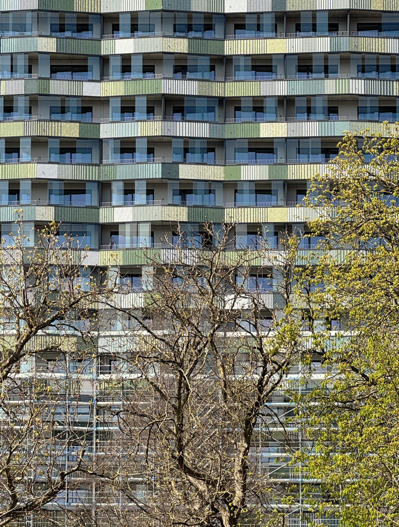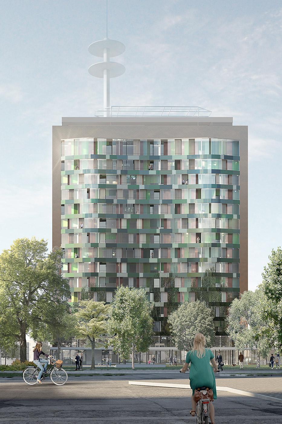 The dominance of the office tower is counteracted by colour, materiality and detail. A screen of loggias is added to the long sides of the high-rise, extending each apartment with an exterior space that can be adapted according to individual needs. The screen lends a lighter appearance to the building while at the same time revealing the variety of uses behind. The glased ceramic cladding of the balustrades picks up the various colour shades of the adjacent park and adds a sense of movement to the façade. The shimmer of the overall image works in correspondence with the atmosphere of the surrounding urban landscape.