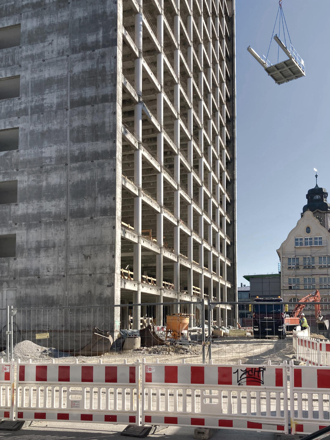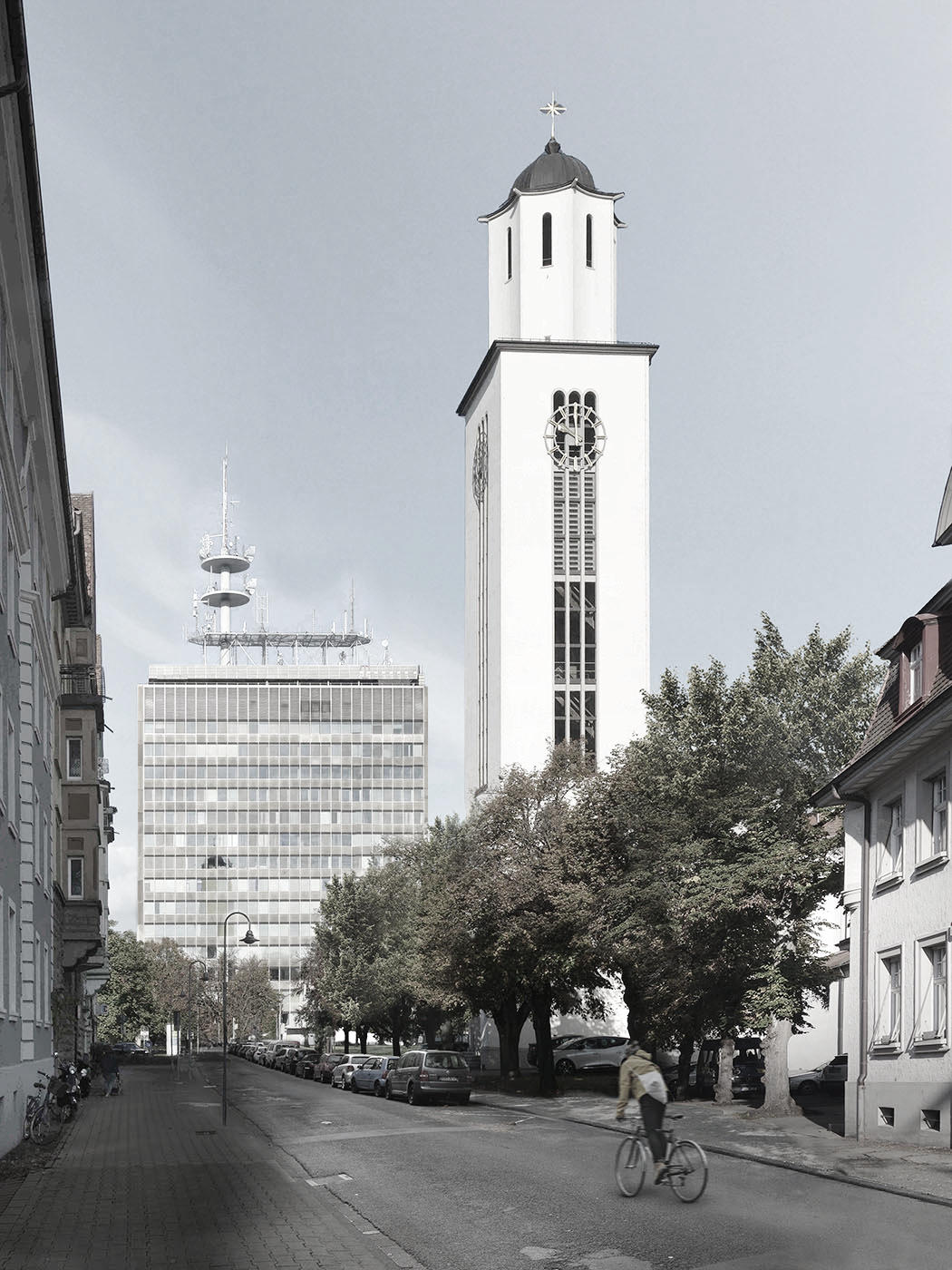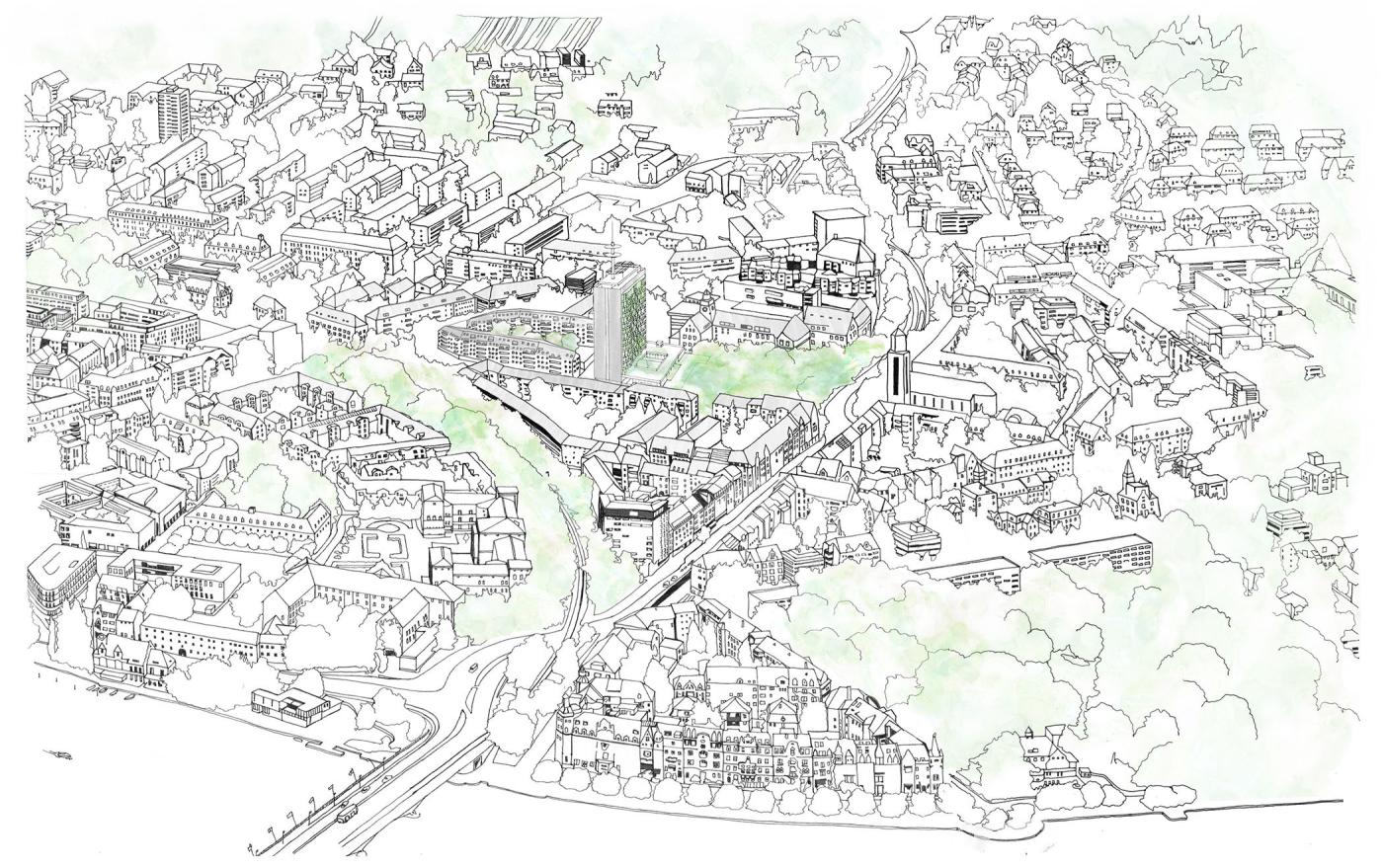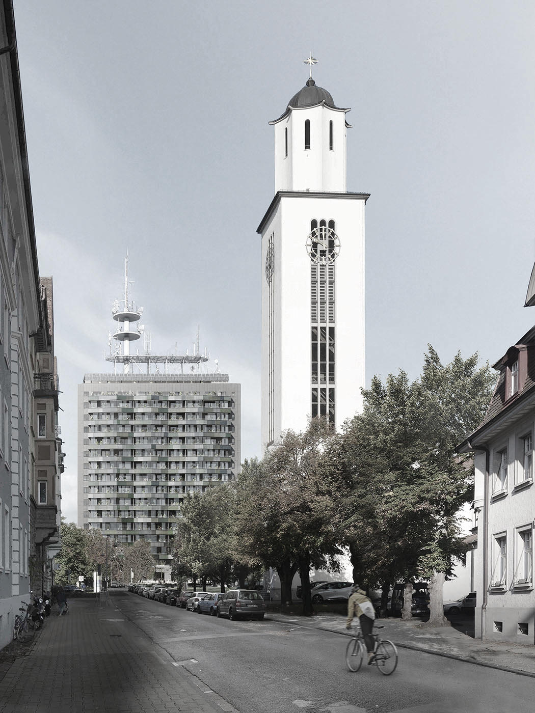 The former Telekom high-rise will be converted from a structure for office use into one for residences. Through its scale and presence, the building stands in stark contrast to its surroundings. Nevertheless, the decision to preserve the tower and avoid demolition makes sense: on the one hand, a sustainable solution is reached if the primary structure of the existing building and thus the ‘grey energy’ contained in its reinforced concrete components can be preserved and reused; on the other, this construction form – ie a tower - offers a different kind of sustainability if it can be put to residential use in a densely populated city that has generous green spaces.