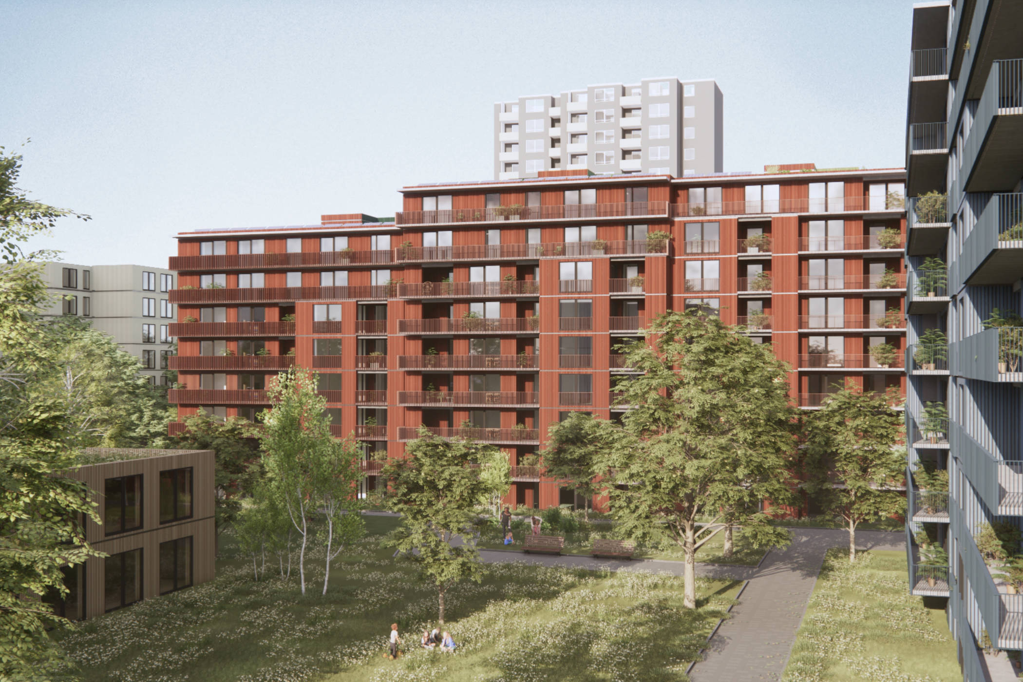 - Development of a residential quarter with day-care centre and commercial units, an existing 16-storey office high-rise is converted for residential use