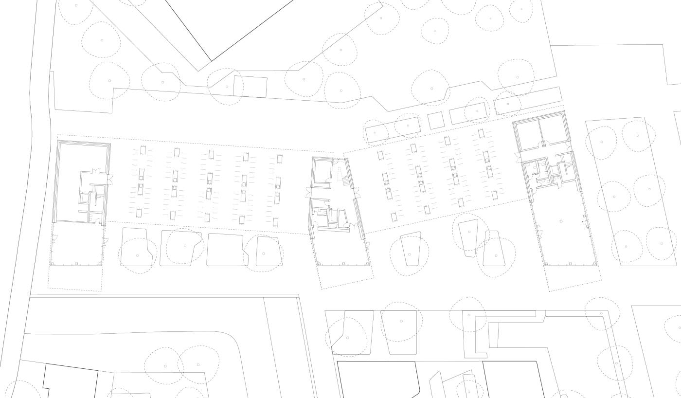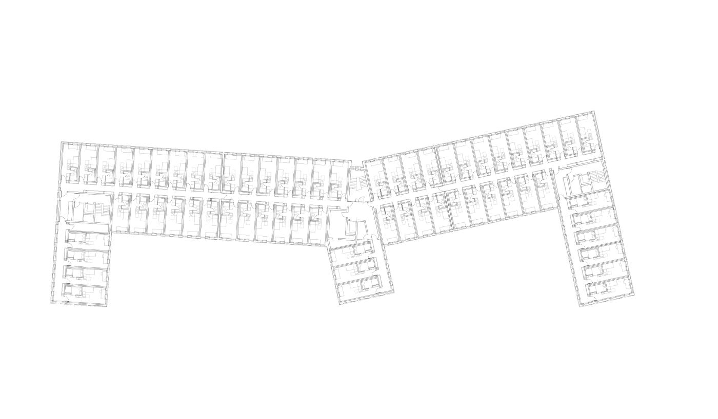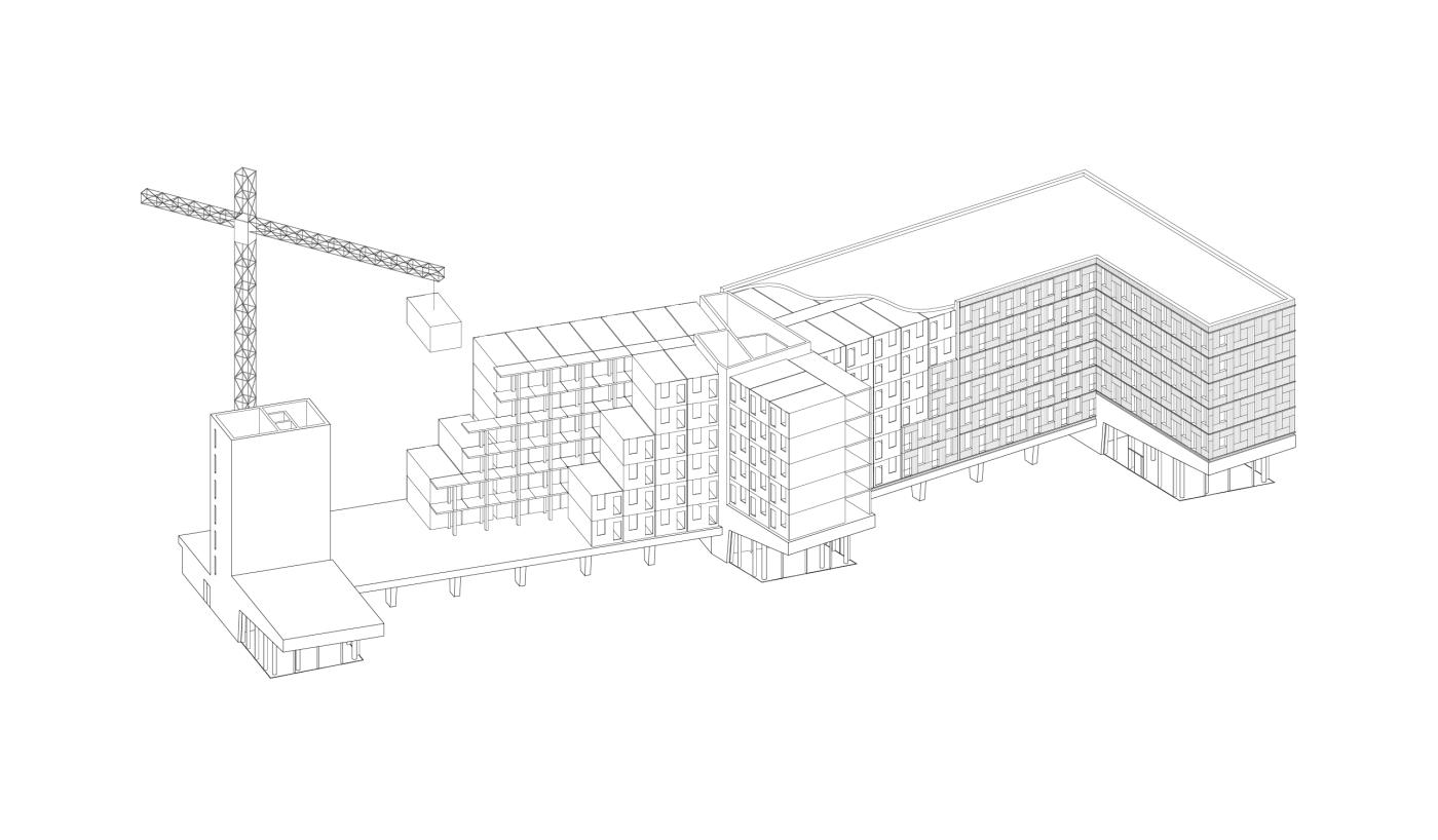 The purpose and the functional layout of the student hall of residence are clearly expressed on its exterior. The ground floor structure and the three service cores are in conventional reinforced concrete construction with an additional outer shell of exposed concrete. Simply put, the ground floor structure is a kind of concrete table, on which the 371 residential modules are stacked for five or six floors. Below the cantilevered tabletop at the cores, there are spaces for communal use and gastronomy, which have full-height glazing. The open-air ground floor space between the cores not only makes the building permeable within the city's built fabric, but also provides covered parking for some four hundred bicycles.