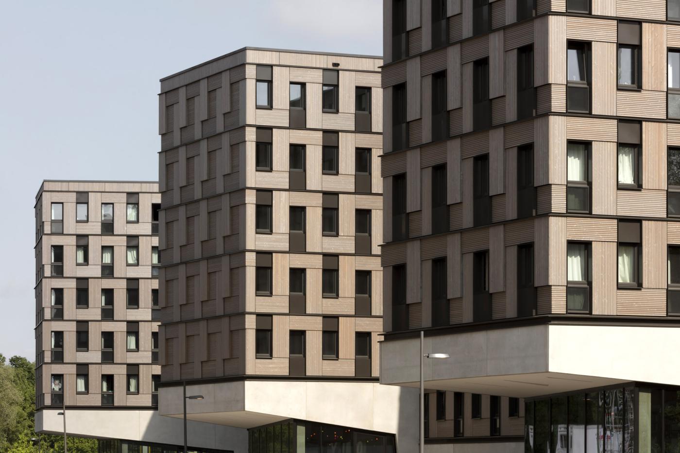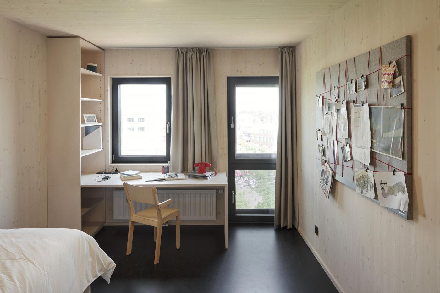As the world's largest residential building in modular timber construction, at the time of its completion, “Woodie” offers micro-appartments for 371 students. The building is part of a new residential district in the Wilhelmsburg area of Hamburg, which builds on the experimental character of the 2013 International Building Exhibition and embodies the principles of Universal Design: sustainable, simple and inclusive.